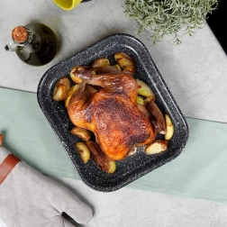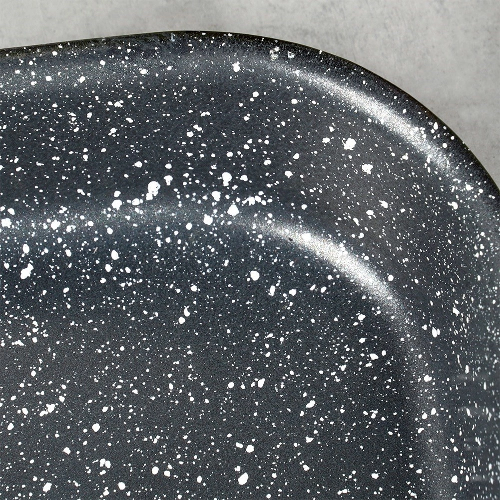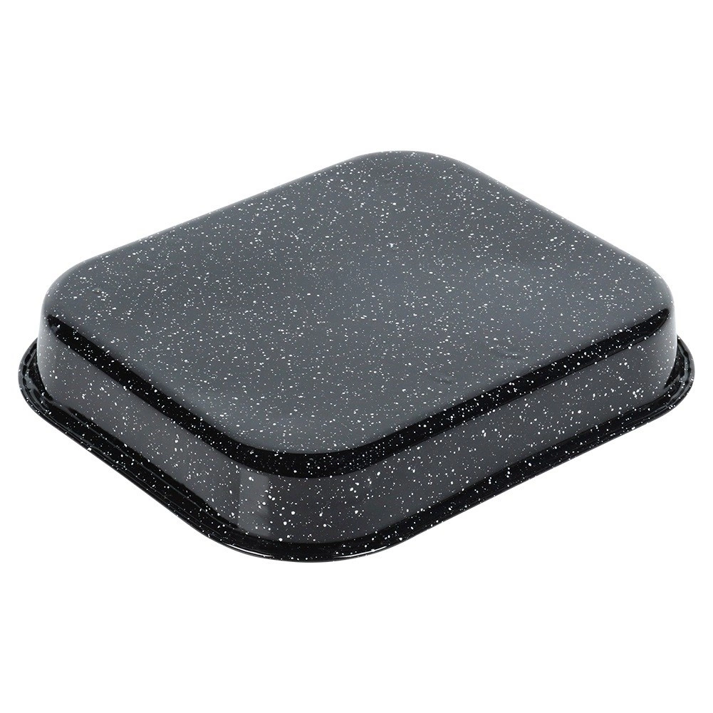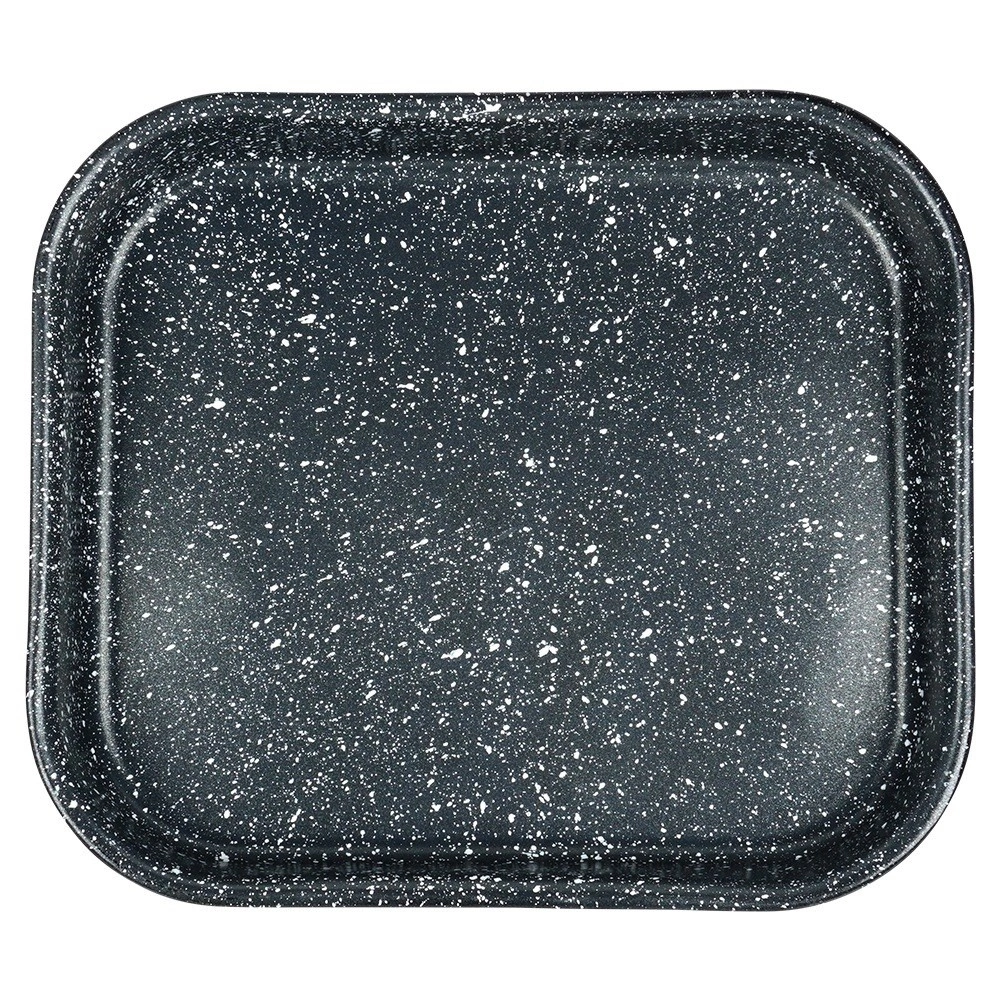 Tvirta plieninė kepimo forma su emaliuotu korpusu ir granito, itin patvaria nelipnia danga užtikrina tolygų kepimą ir patogų patiekalų išėmimą. Vidiniai matmenys 27 × 23 × 4 cm puikiai tinka kepti vištienai, daržovėms, pyragams ir naminei picai.