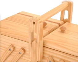 Praktiška medinė siuvimo spintelė su armonikos tipo atidarymu, aiškiam siūlų, adatų ir smulkių reikmenų laikymui. Dėl 30 × 16 × 20 cm matmenų ji yra kompaktiška, kartu erdvi ir su patogia rankena lengvam nešiojimui. Lengvas atidarymas vienu judesiu ir 5 aiškiai suskirstytos pertvaros užtikrina tvarką siuvant ir kuriant.