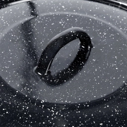Plieninis korpusas su emaliu yra atsparus įbrėžimams ir korozijai, o tvirtas laikiklis užtikrina saugų pakėlimą net esant aukštesnei temperatūrai. Emalis gali natūraliai turėti smulkių gamybinių netolygumų (iškilimų, netolygaus padengimo ir pan.), kurie neveikia kokybės ar funkcionalumo.