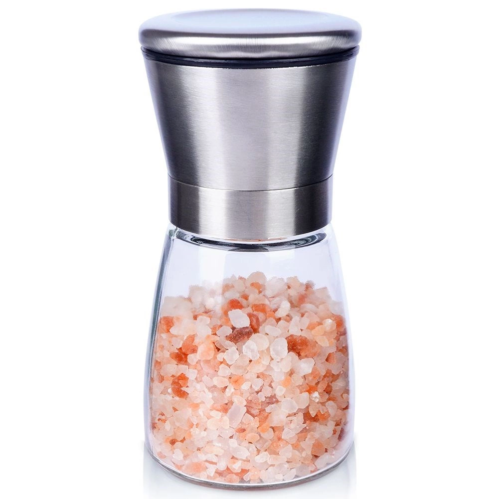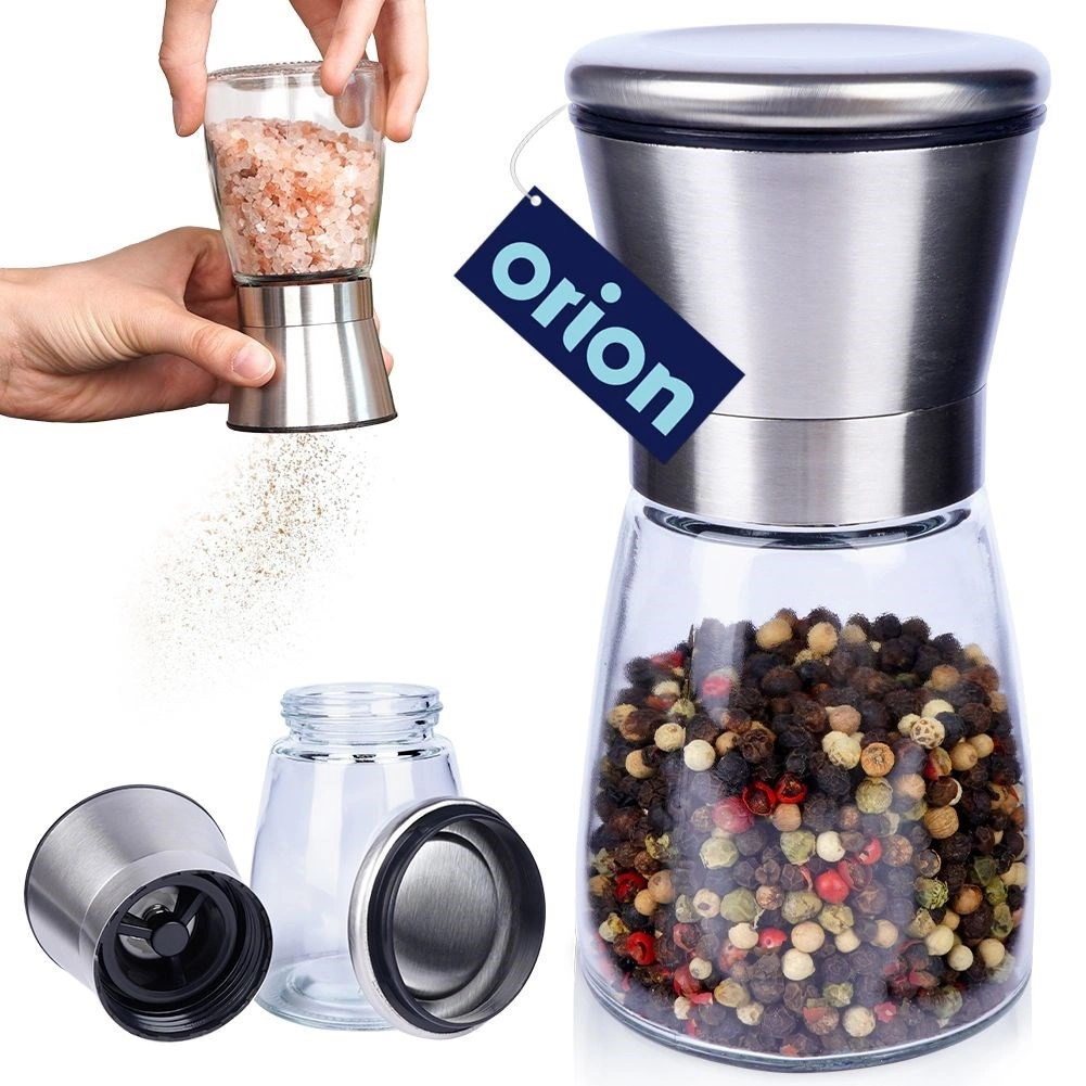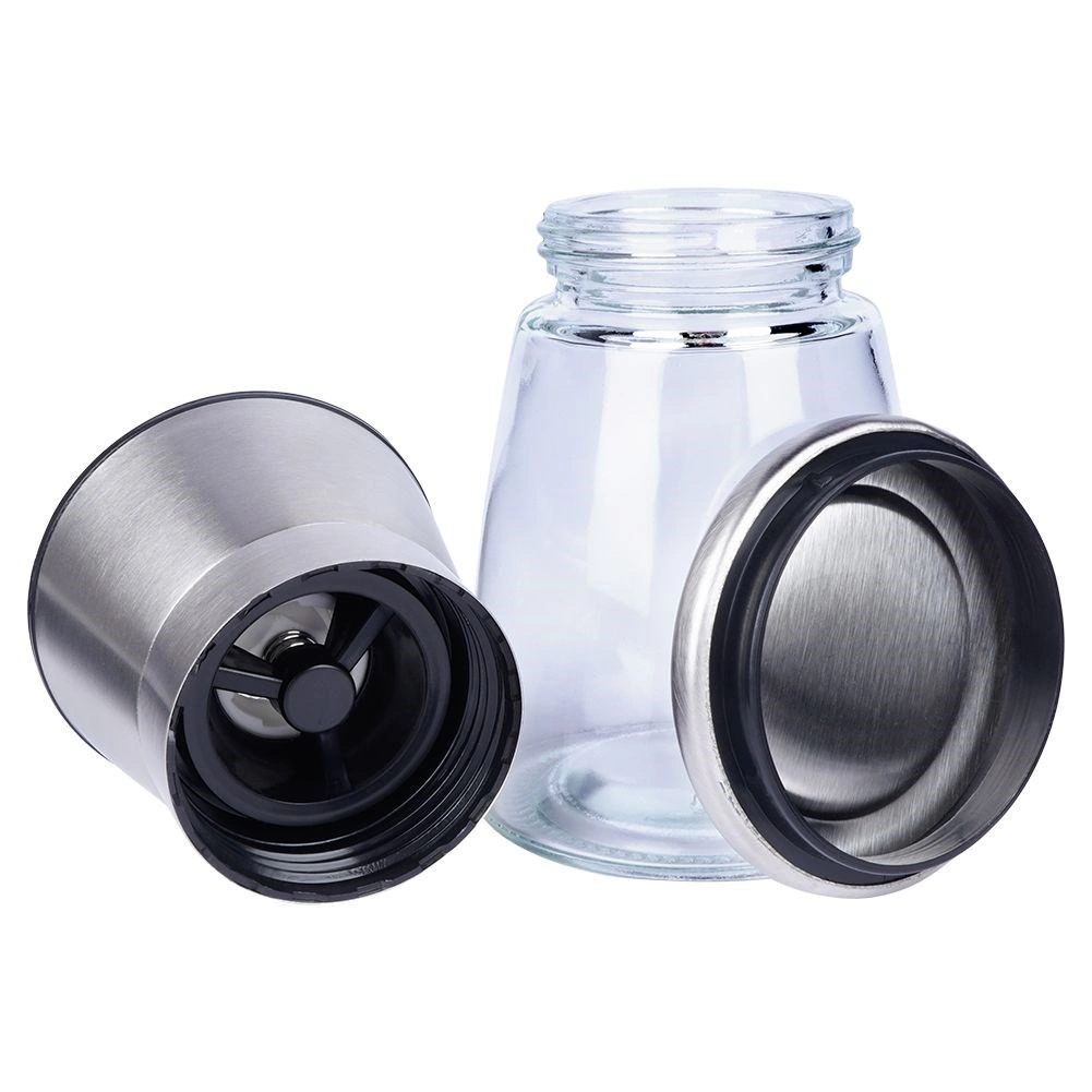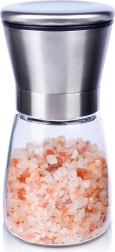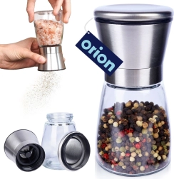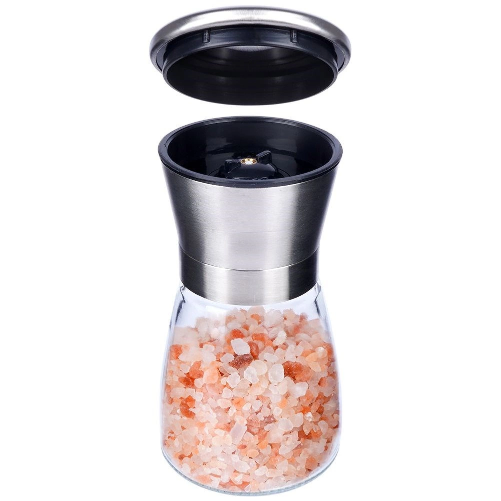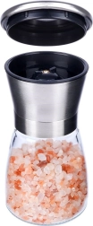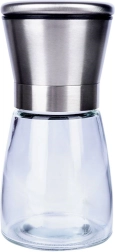 Praktiškas rankinis malūnėlis druskai, pipirams ir kitiems prieskoniams, 13,5 cm aukščio, derinantis stiklą ir nerūdijantį plieną ilgam tarnavimui. Turi keraminį malimo mechanizmą, nepertraukiamą rupumo reguliavimą ir užsukamą dangtelį, apsaugantį nuo išbyrėjimo. Elegantiškas dizainas puikiai tinka bet kuriai virtuvei ir stalui.