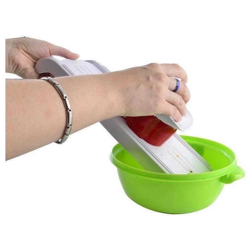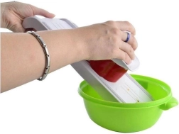 Praktiška daržovių ir vaisių pjaustyklė, kurios matmenys 36 × 12,5 × 4 cm, siūlo keičiamus antgalius pjaustymui ir tarkavimui, aštrų nerūdijančio plieno peilį ir saugos laikiklį patogiam ir saugiam darbui. Dėl tvirtos konstrukcijos, nuožulnios formos ir išpjovos atramai į dubens kraštą pjaustymas yra greitas, tikslus ir be pastangų.