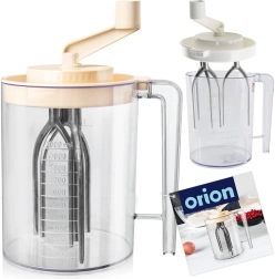 Rankinis plaktuvas ORION sujungia plakiklį, šluotelę ir matavimo ąsotį viename. Permatoma talpa su skale (100–1000 ml ir 1/4, 1/2, 3/4, 1 l) palengvina tikslų ingredientų dozavimą. Mechaninė rankenėlė suka vidinius plakiklius, todėl maišote efektyviai, be elektros poreikio ir be taškymosi dėl uždaro dangtelio.