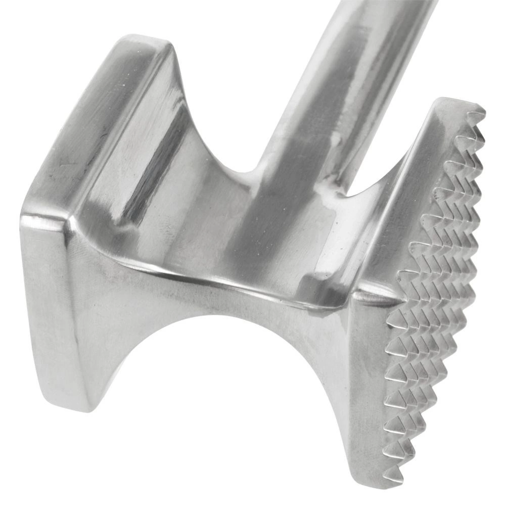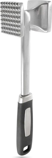 Praktiškas dvipusis aliuminio minkštintuvas, 26,5 cm ilgio, su dviem darbo paviršiais – lygus plokštinimui ir faktūrinis mušimui bei minkštinimui. Ergonomiška neslystanti rankena užtikrina tvirtą suėmimą, įrankis yra patvarus, lengvai valomas ir tinkamas įvairioms mėsos rūšims bei kitiems ingredientams.