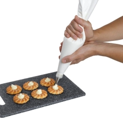 Palengvinkite desertų ir sūrių patiekalų dekoravimą su 40 × 23 cm dydžio medvilniniu konditeriniu maišeliu. Vidinė guminė danga užtikrina tolygų kremų ir įdarų tekėjimą, nesvarbu, ar jie tiršti, ar labiau skysti. Universalus dydis tinka įvairioms plieninėms dekoravimo antgaliams.