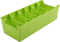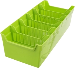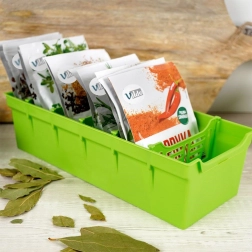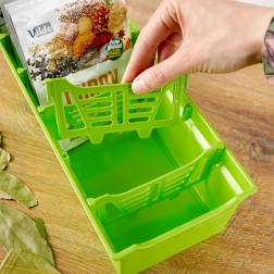 Tvarkingai ir estetiškai susidėliokite žoleles ir prieskonius. Žalias prieskonių organizatorius puikiai tinka laikyti prieskonių maišelius – tiek atidarytus, tiek uždarytus. Viduje yra penkios išimamos pertvaros, kurios padalija dėžutę į šešias dalis, tad turėsite pakankamai vietos ir aiškią tvarką kasdieniam gaminimui.