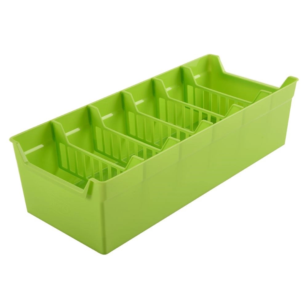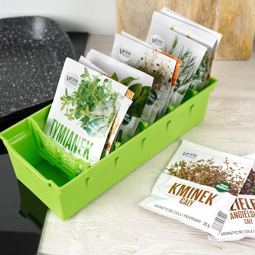 Praktiškas virtuvės prieskonių laikiklis, kurio matmenys 30 × 13 × 8 cm, padės palaikyti tvarką prieskonių maišeliuose. Dėl išimamų pertvarų prieskonius suskirstysite pagal poreikį, greitai rasite reikiamą maišelį ir išvengsite išbyrėjimo. Lengvas ir kartu tvirtas plastikas žalia spalva tiks kiekvienoje virtuvėje.