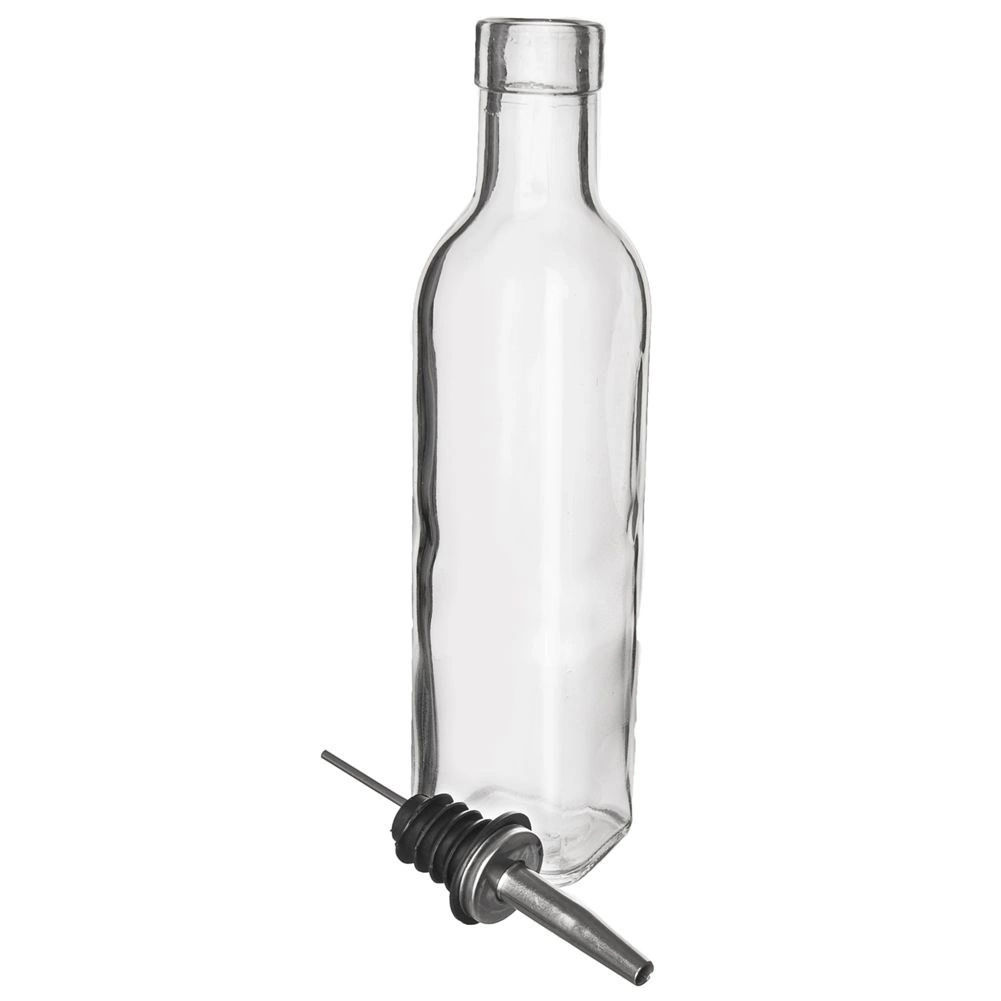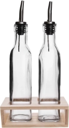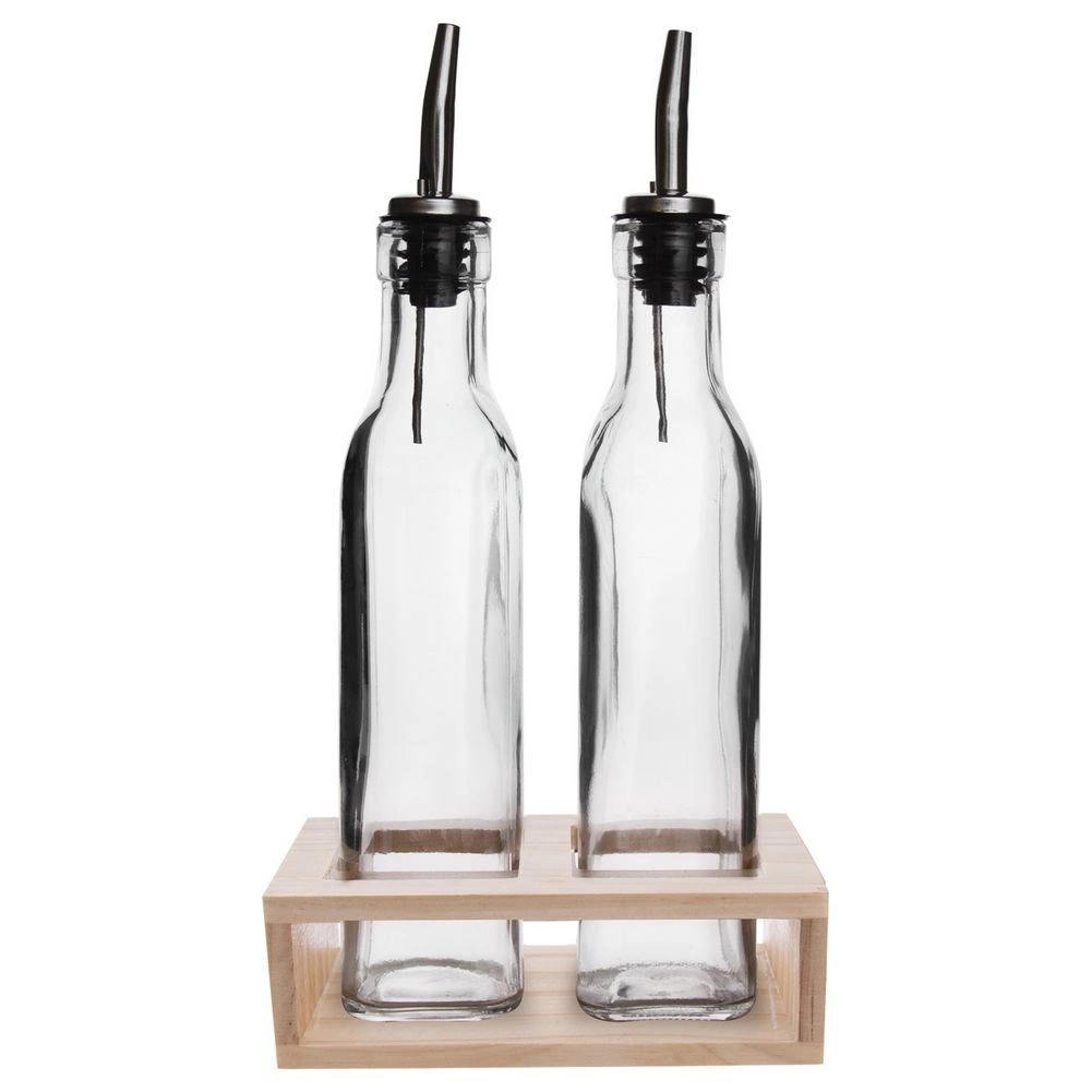 Šis praktiškas ir dekoratyvus rinkinys apima du skaidraus stiklo butelius su nuimamais metaliniais dozatoriais ir stabilų medinį stovą. Idealu pirmojo spaudimo alyvuogių aliejui, balzaminiam ar vyno actui ir kitiems pagardams. Dozatoriai lėtina srautą švelniam salotų, makaronų ir picos pagardinimui be netvarkos.