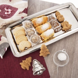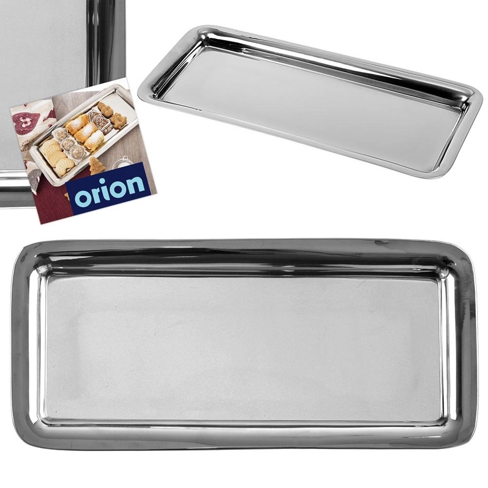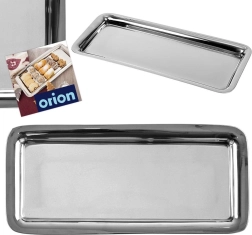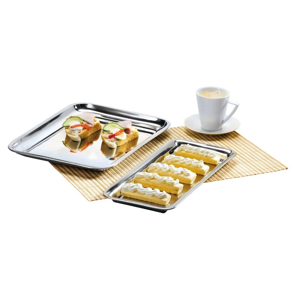 Praktiška stačiakampė lėkštė iš kokybiško nerūdijančio plieno elegantiškos sidabrinės spalvos. Idealiai tinka patiekti kanapes, vieno kąsnio užkandžius, užkandėlius, saldumynus ir desertus. Dėl paaukštinto krašto ja patogu manipuliuoti, o maistas išlieka saugiai vietoje.