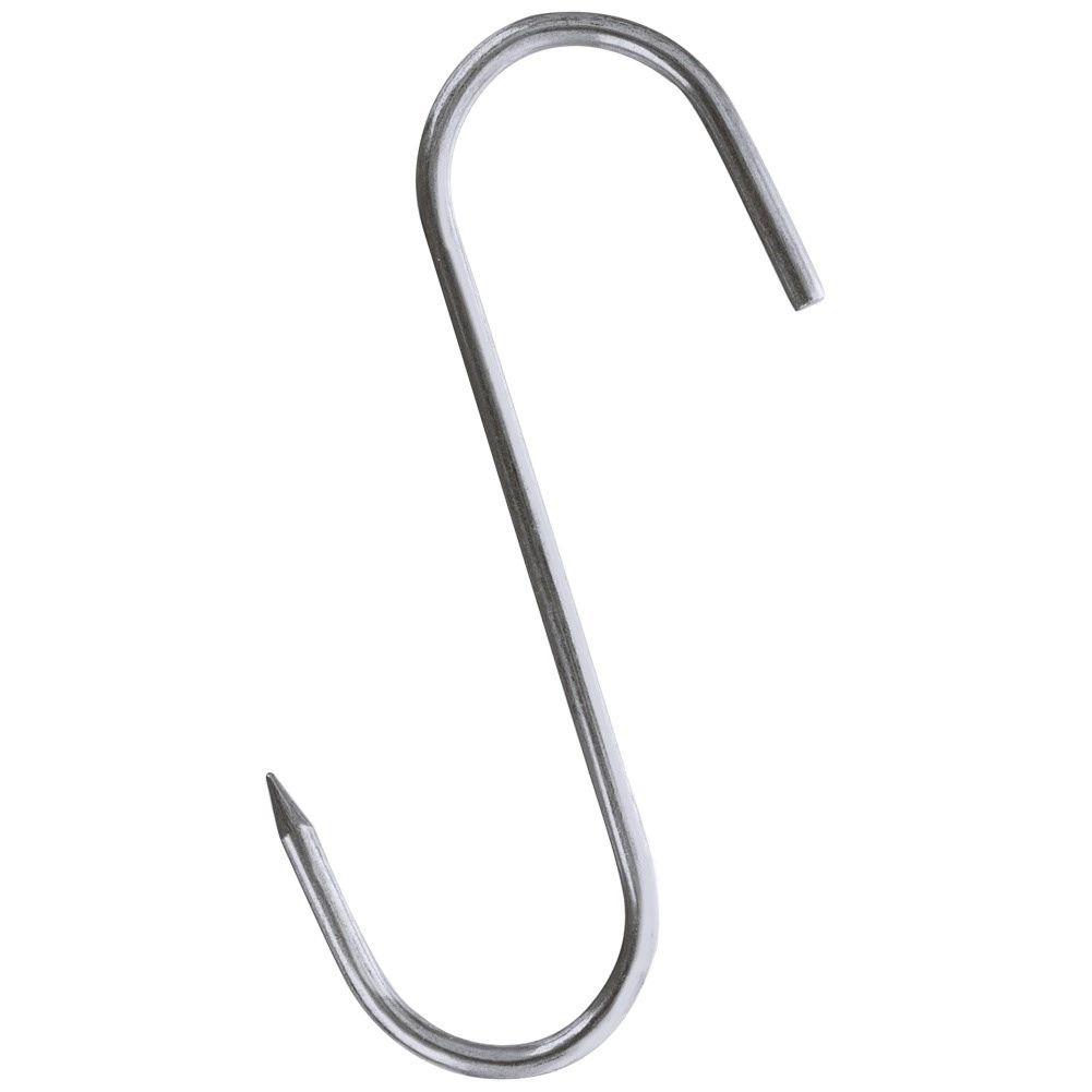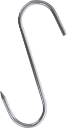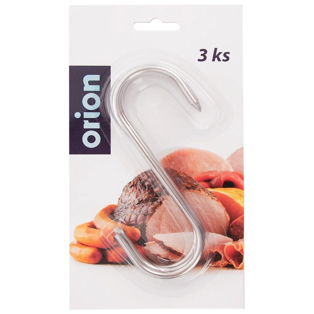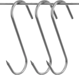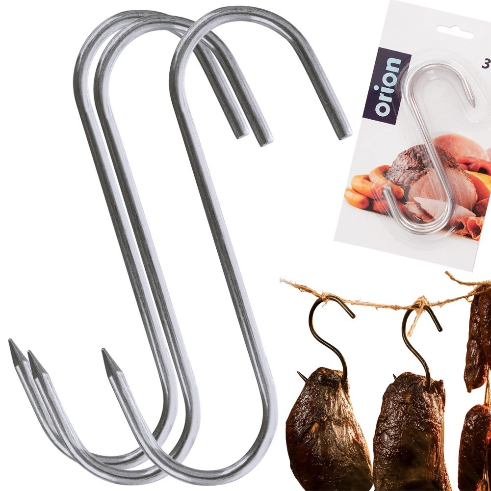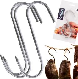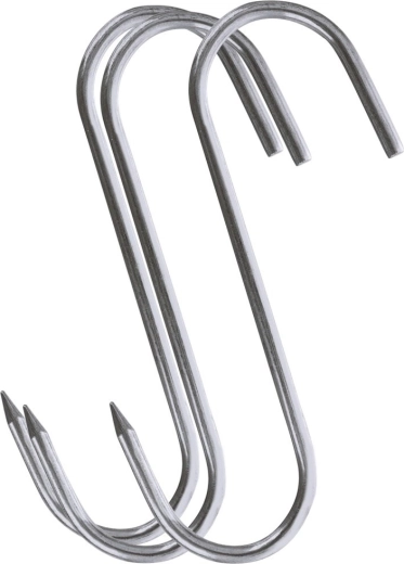 Trijų nerūdijančio plieno kablių rinkinys rūkyklai, dydis 13,5 × 9 cm, vielos skersmuo 0,5 cm, puikiai tinka namų ir profesionaliam rūkymui. Aštrus vienos pusės galiukas palengvina didesnių mėsos gabalų pradūrimą, o atvira S forma leidžia greitai pakabinti ant rūkyklos strypų.