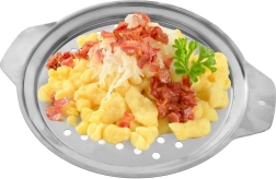 Praktiška plieninė spaetzlių tarkuotė su laikikliais ir mentele lengvam tešlos spaudimui. Tinka puodams, kurių skersmuo 24–26 cm, su 8 mm angomis. Pagaminta iš kokybiško nerūdijančio plieno, lengvai valoma ir tinkama plauti indaplovėje. Idealu haluškams, gnocchi ir pilamai tešlai, taip pat galima naudoti kaip sietelį košimui ir garinimui.