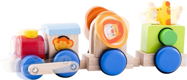 Traukinukas pagamintas iš patvarios masyvios medienos, kuri užtikrina ilgaamžiškumą. Dizainą papildo gražios gyvūnų iliustracijos ir ryškios spalvų kombinacijos, kurios traukia dėmesį ir daro žaidimą dar smagesnį.
