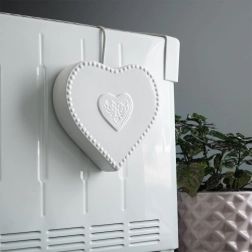 Balta glazūra, perlinis kraštelis ir reljefinė širdelės tekstūra suteikia radiatoriui ir patalpai elegantišką išvaizdą.