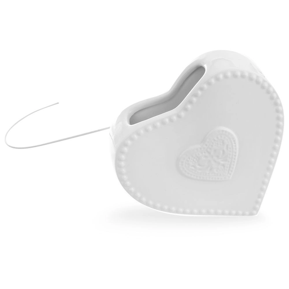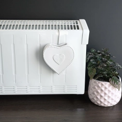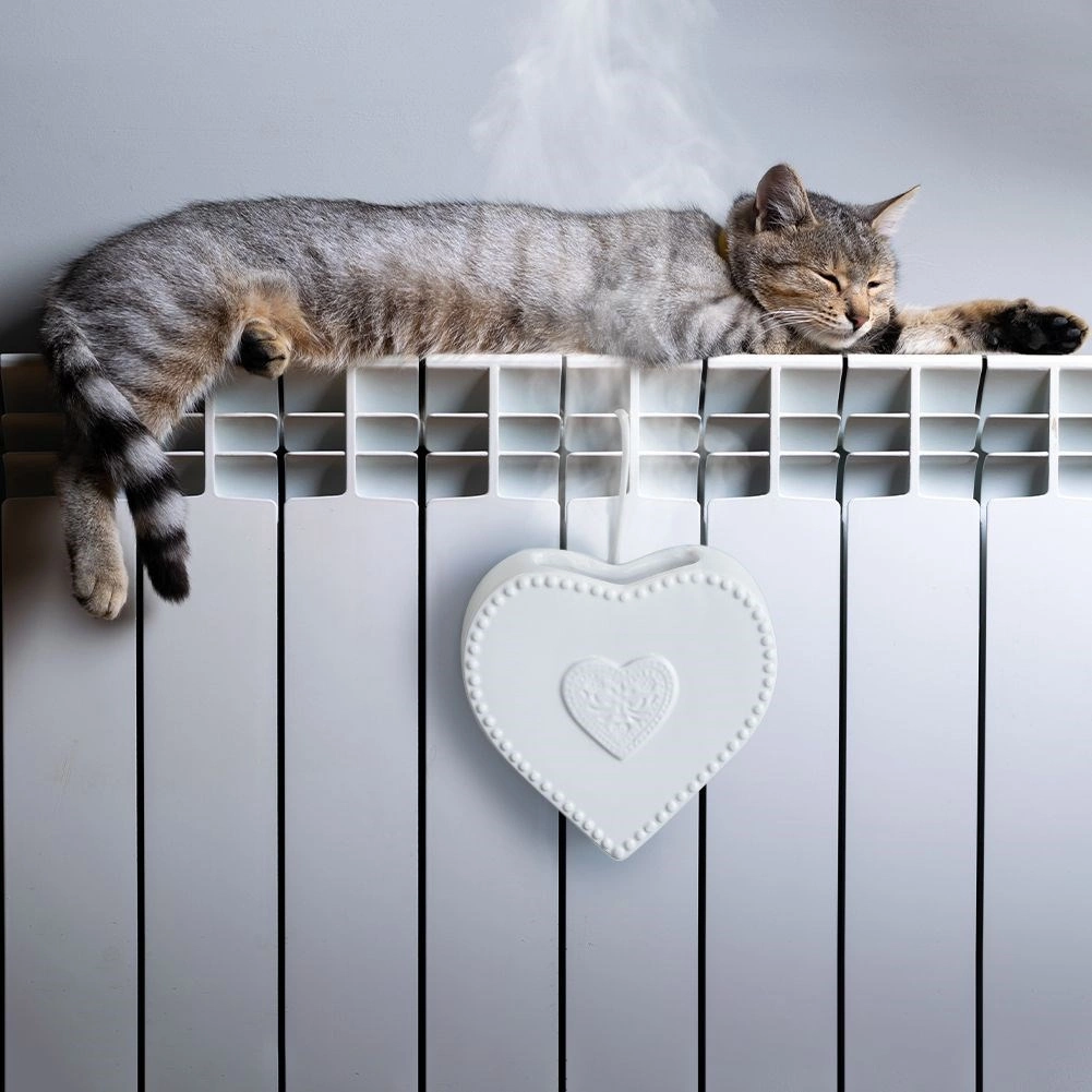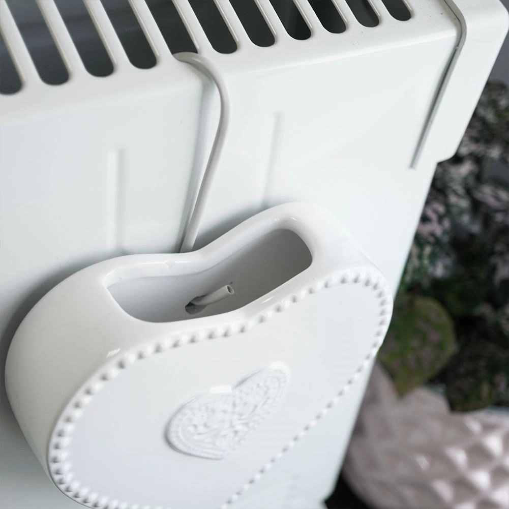 Šis baltas keraminis radiatoriaus drėkintuvas su subtiliu širdelės reljefu yra praktiškas sprendimas kovojant su sausu oru šildymo laikotarpiu. Tereikia jį pripildyti vandeniu ir pakabinti ant radiatoriaus naudojant metalinį kabliuką – vanduo pamažu garuoja ir gerina patalpos mikroklimatą.