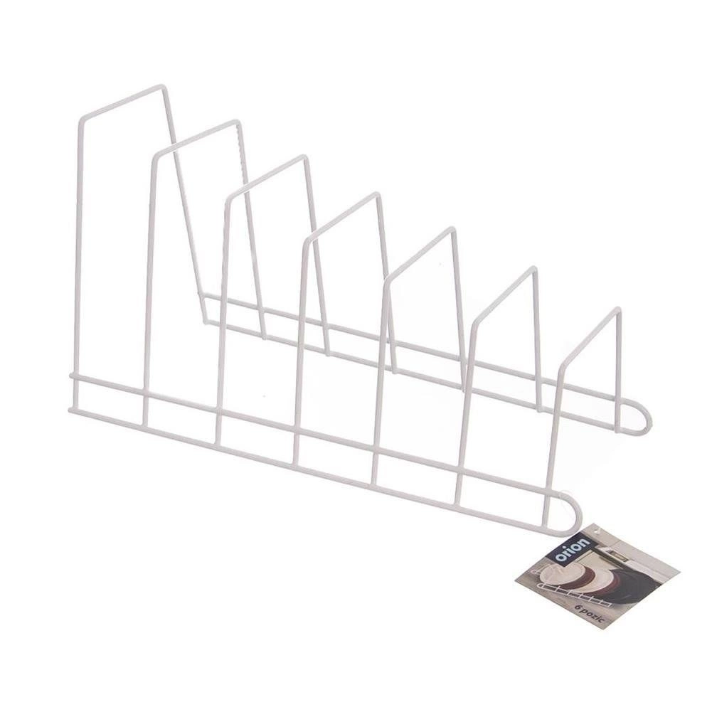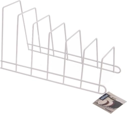 Praktiškas metalinis virtuvės organizatorius vertikaliam iki 6 vienetų – dangtelių, lėkščių arba pjaustymo lentelių – laikymui. Stabili baltos spalvos vielinė konstrukcija taupo vietą spintelėse ir stalčiuose, užtikrina tvarką ir saugo dangtelius nuo įbrėžimų. Lengvai valomas ir puikiai tinka tiek modernioms, tiek klasikinėms virtuvėms.