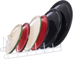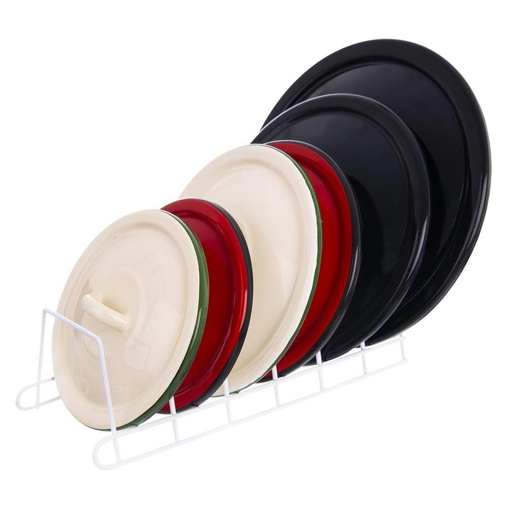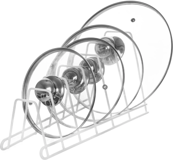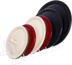 Užtikrinkite tvarką virtuvėje su kompaktišku stovu, turinčiu 6 pozicijas. Atvira vielinė konstrukcija laiko dangtelius, seklas lėkštes ir lenteles aiškiai ir su greita prieiga, kartu neleidžia jiems slankioti ir būti pažeistiems. Pastatykite ant stalviršio, į spintelę arba į gilų stalčių.
