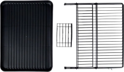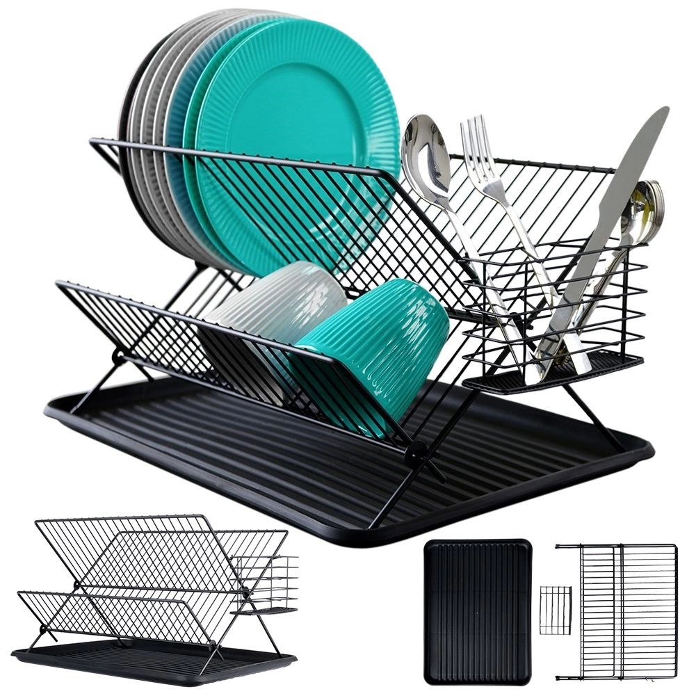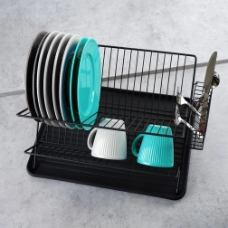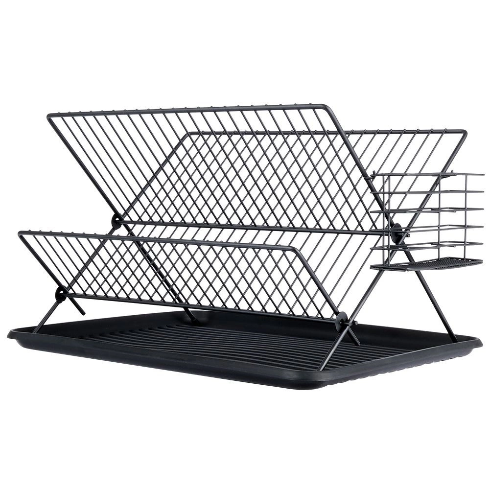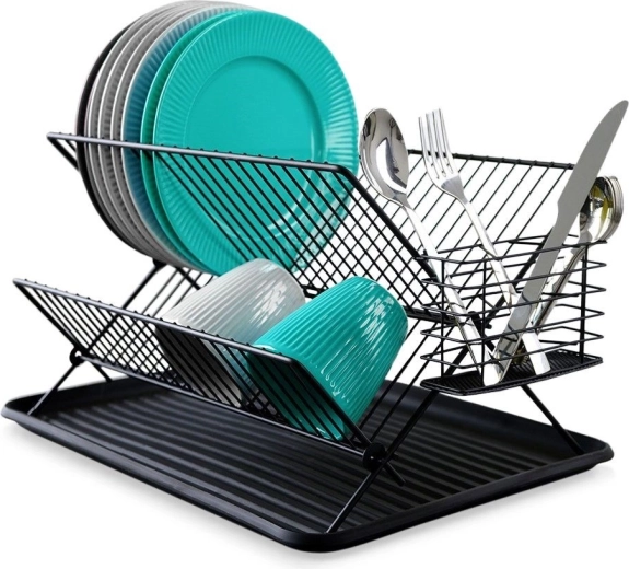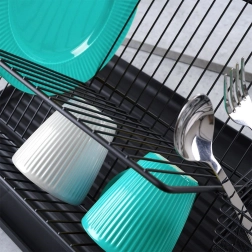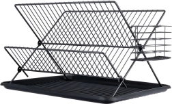 Elegantiškas dviejų aukštų indų džiovintuvas juodos spalvos, 45 × 32 × 25,5 cm, padės tvarkingai sudėti ir greitai išdžiovinti lėkštes, dubenėlius, puodelius ir stalo įrankius. Dėl tvirtos metalinės konstrukcijos, neslystančių kojelių ir išimamo lašėjimo padėklo jūsų stalviršis išliks sausas ir švarus. Modernus industrinis dizainas puikiai tinka bet kuriai virtuvei.
