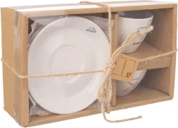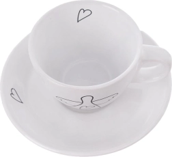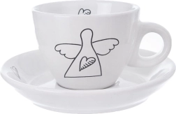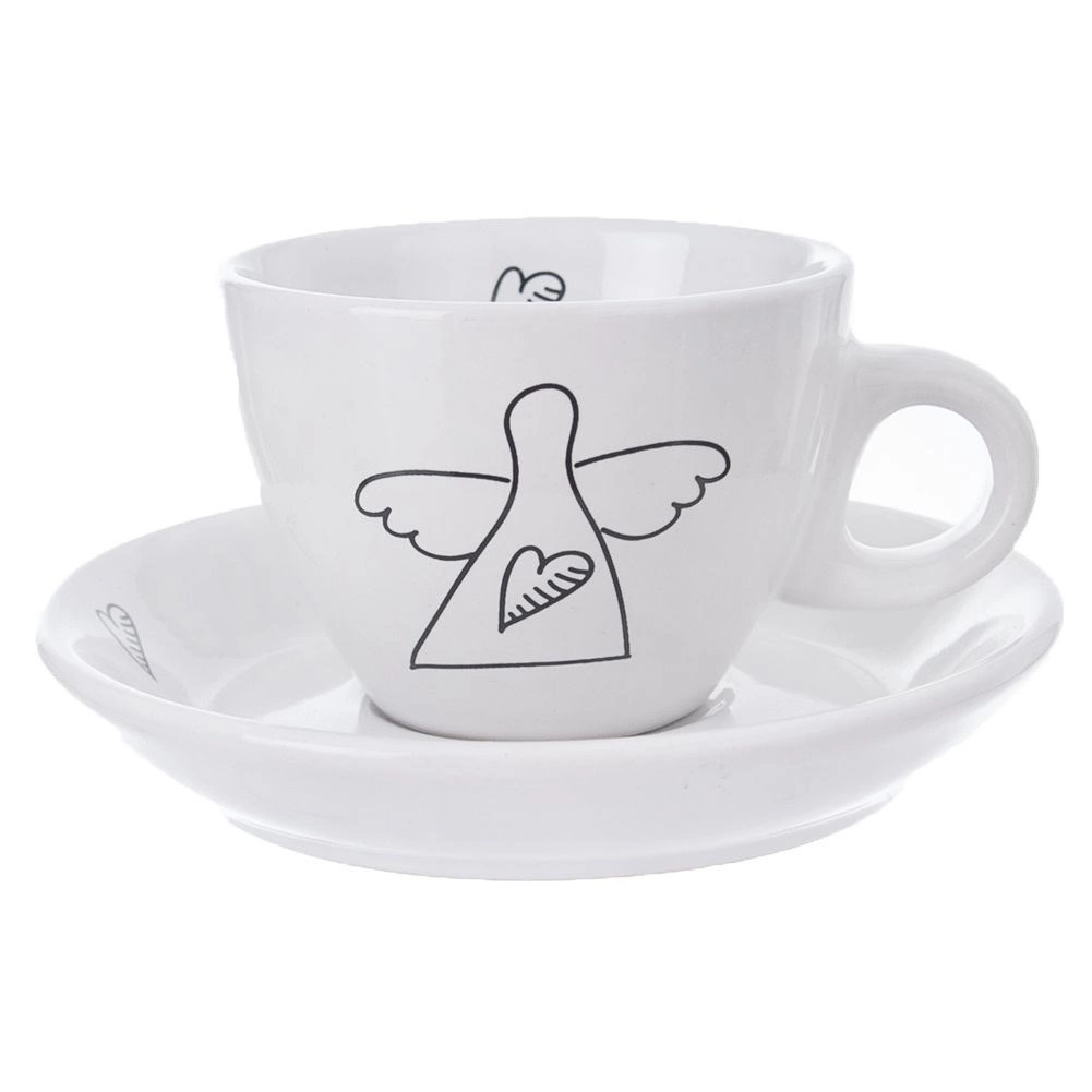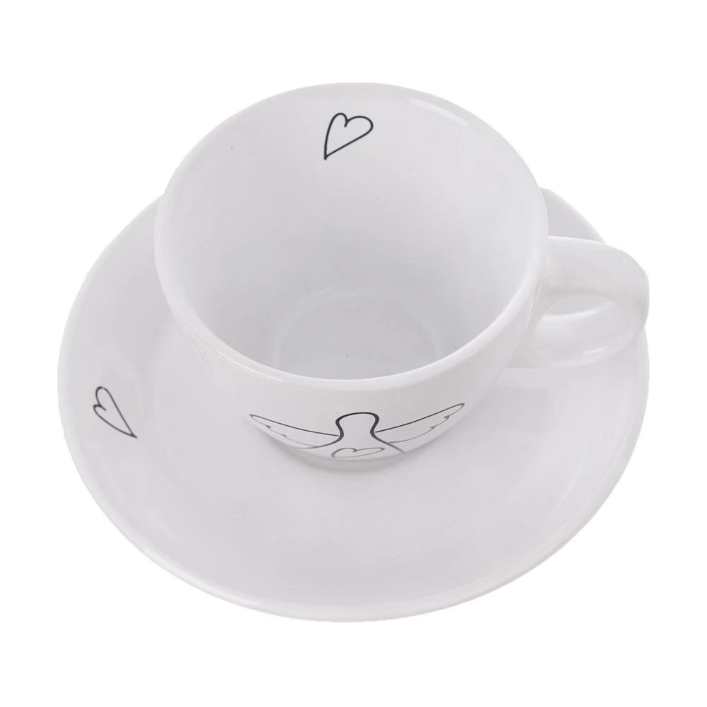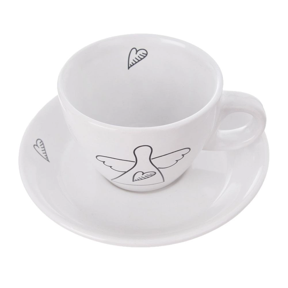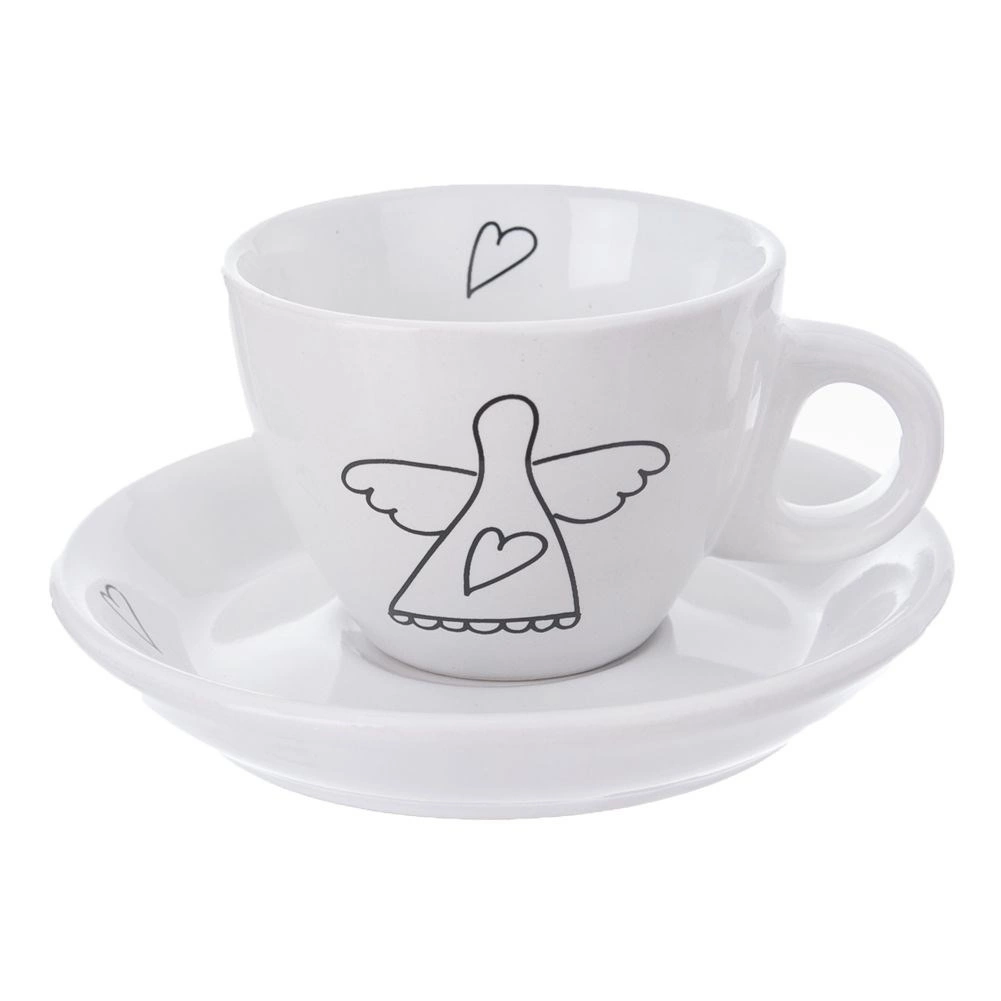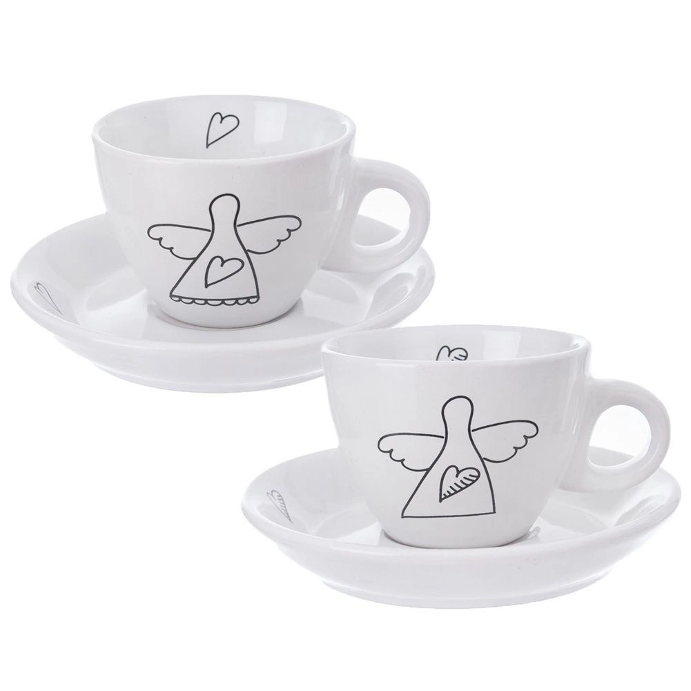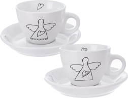 Elegantiškas dviejų espreso puodelių su lėkštutėmis rinkinys iš kokybiškos keramikos, baltos spalvos, su subtiliu angelo ir širdelių motyvu. Idealu 90 ml espreso, tinkama indaplovei ir mikrobangų krosnelei, su patogia ąsele ir dovaniniu įpakavimu.