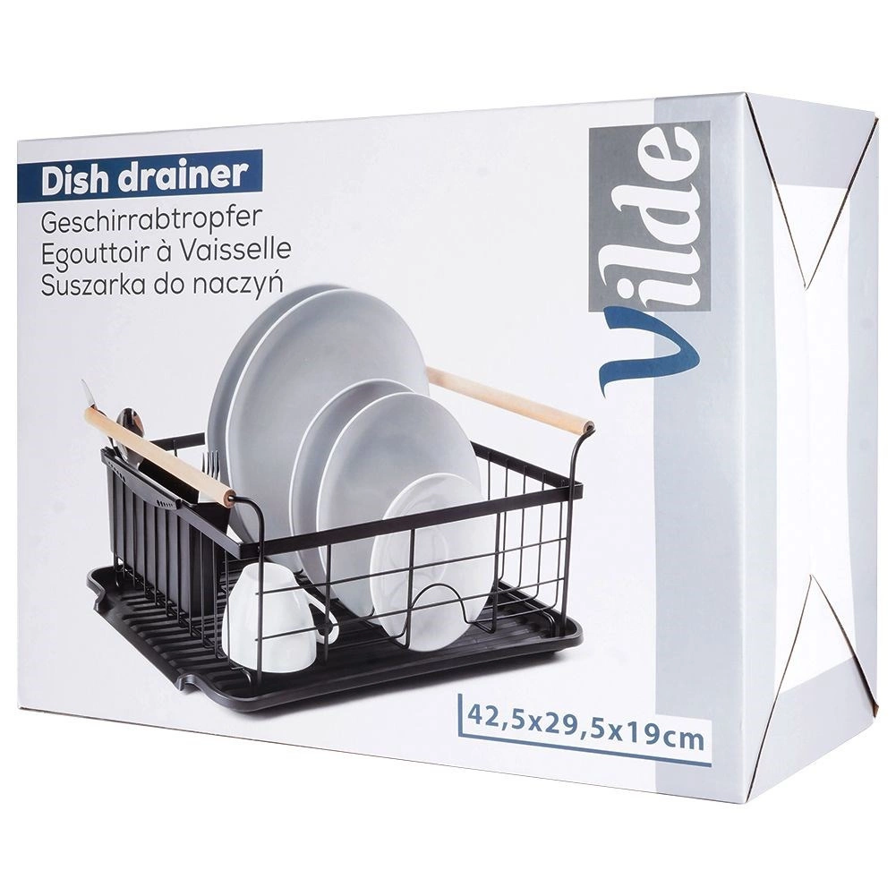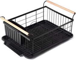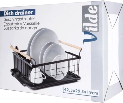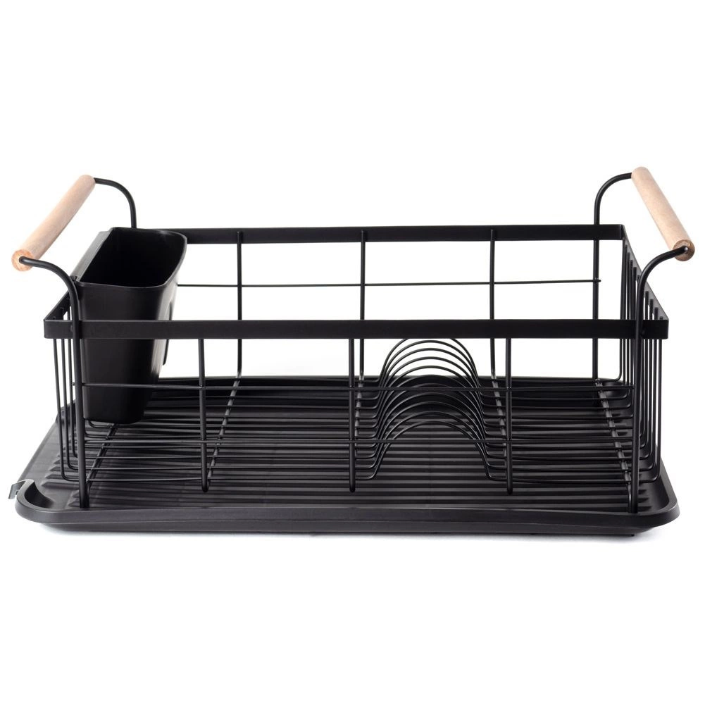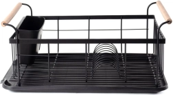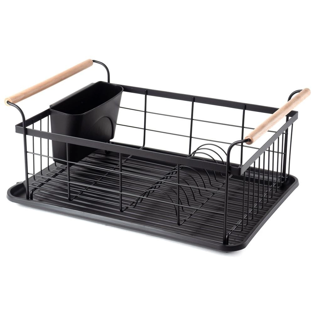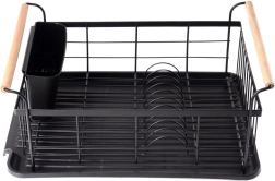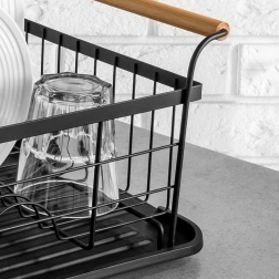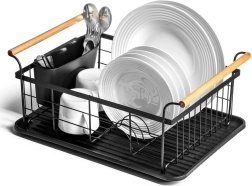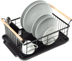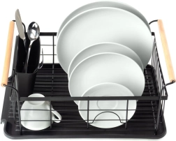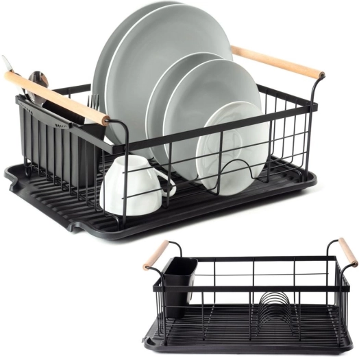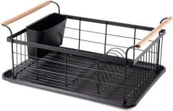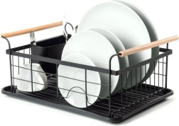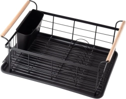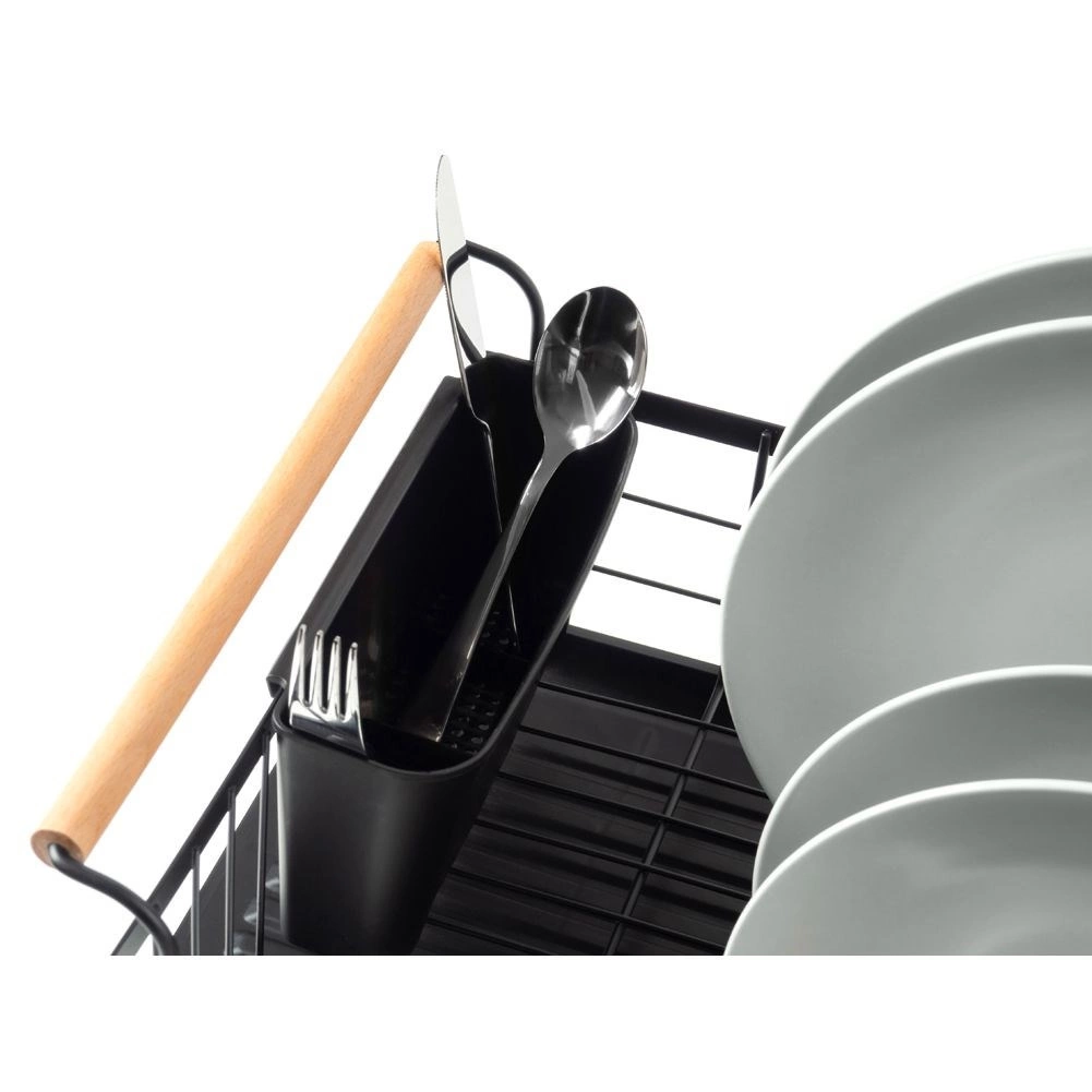 Stilinga juoda indų džiovyklė su mediniais laikikliais palengvina kasdienį indų plovimą ir palaiko sausą virtuvės stalviršį. Ji turi tvirtą metalinę konstrukciją, išimamą lašų surinkimo padėklą ir atskirą stalo įrankių krepšelį, kurį galima pritvirtinti viduje arba išorėje. Minimalistinis dizainas tinka tiek modernioms, tiek klasikinėms virtuvėms, o dėl kompaktiškų matmenų telpa net mažesniuose stalviršiuose.