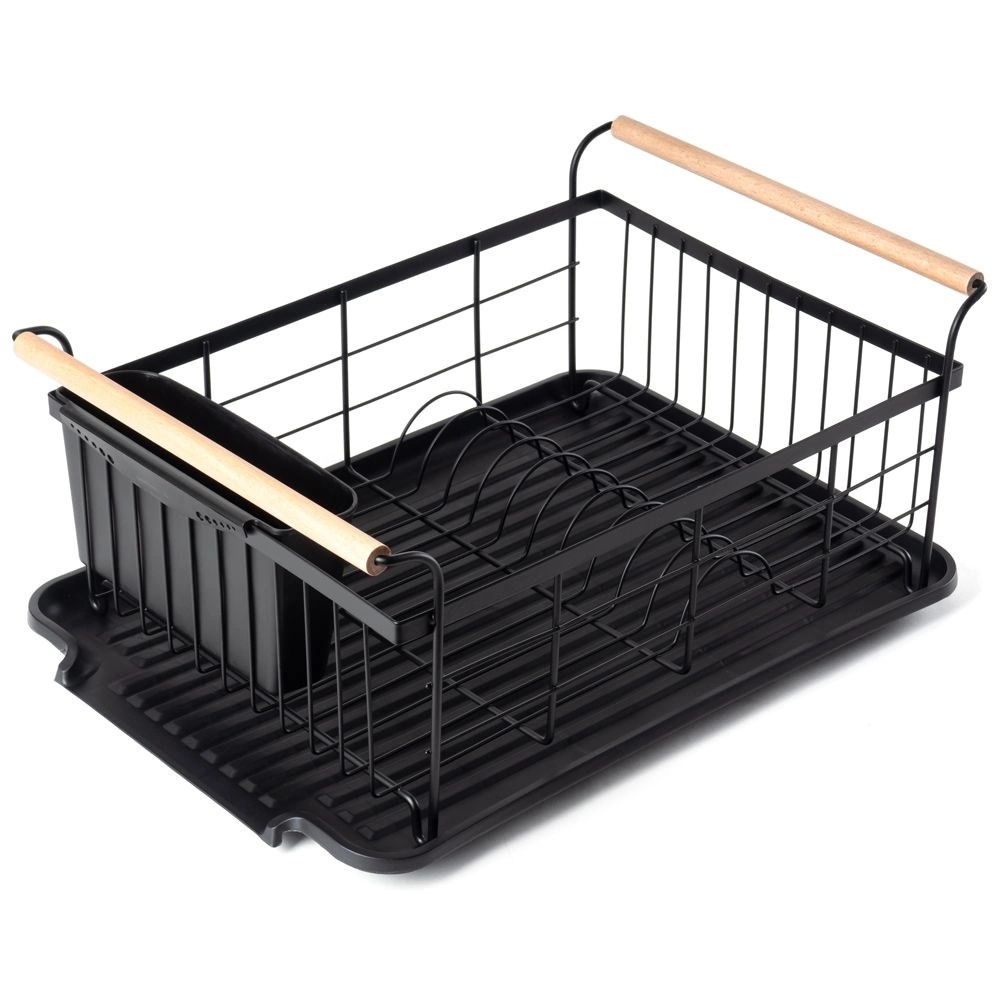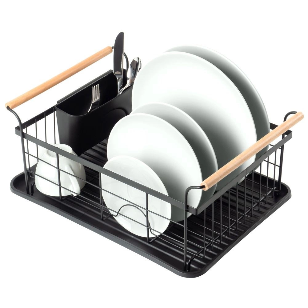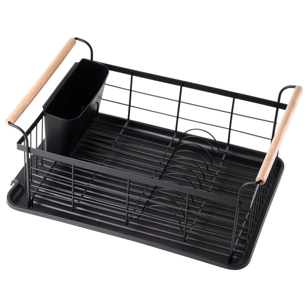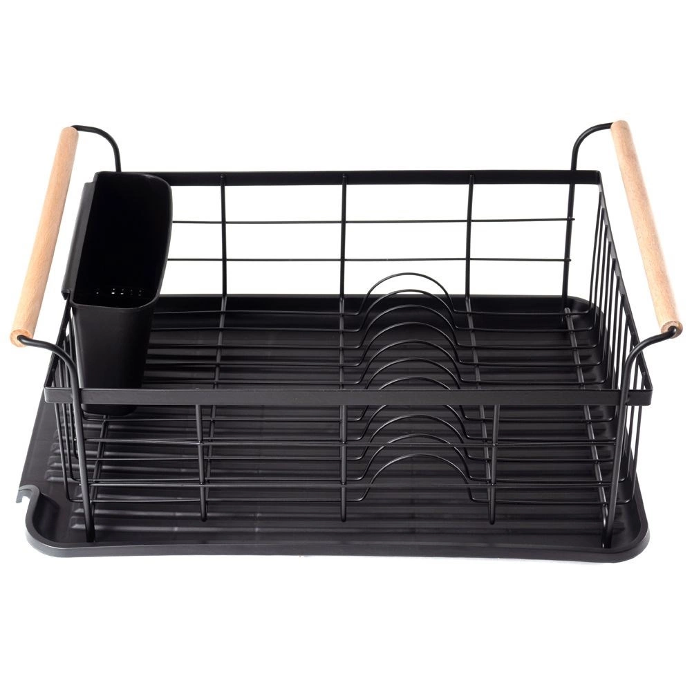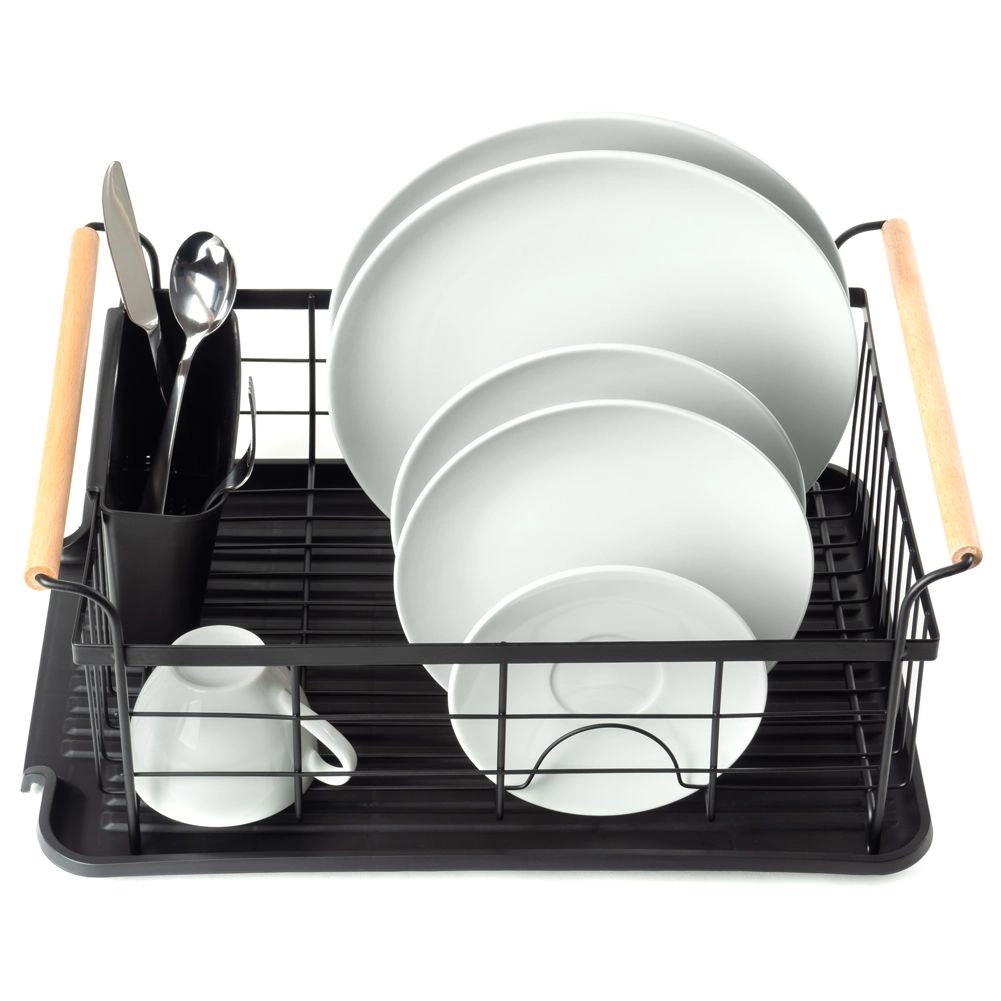 Stilinga juoda indų džiovyklė su mediniais laikikliais palengvina kasdienį indų plovimą ir palaiko sausą virtuvės stalviršį. Ji turi tvirtą metalinę konstrukciją, išimamą lašų surinkimo padėklą ir atskirą stalo įrankių krepšelį, kurį galima pritvirtinti viduje arba išorėje. Minimalistinis dizainas tinka tiek modernioms, tiek klasikinėms virtuvėms, o dėl kompaktiškų matmenų telpa net mažesniuose stalviršiuose.
