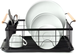Elegantiška ir funkcionali juodai dažyto metalo džiovyklė sujungia didelį patvarumą ir praktiškas detales patogiam lėkščių, stiklinių ir stalo įrankių džiovinimui. Raižytas lašų surinkimo padėklas sulaiko vandenį ir saugo stalviršį, o išstumiamas stalo įrankių krepšelis padeda palaikyti tvarką ir greitą džiūvimą.