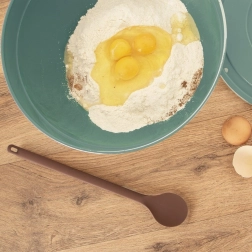 Vientisas dizainas lengvai prižiūrimas – silikonas neįgeria kvapų ir skysčių, gaminį galite plauti indaplovėje. Praktinė neslystanti rankena patogiai laikosi net ilgiau maišant, o skylutė rankenos gale palengvina pakabinimą ant bėgelio.