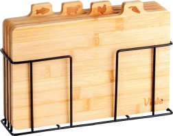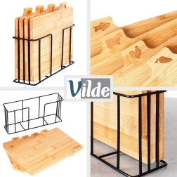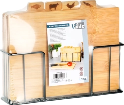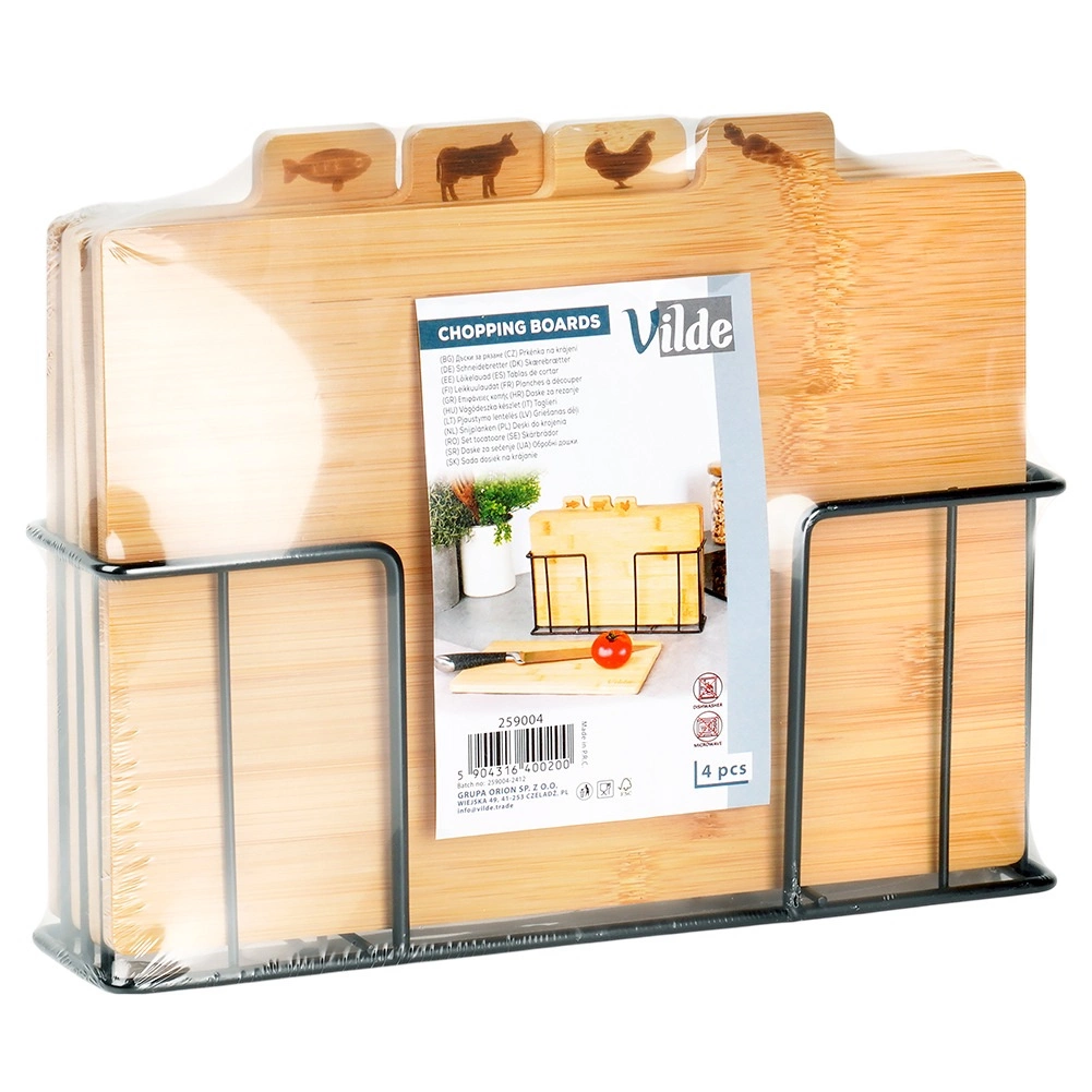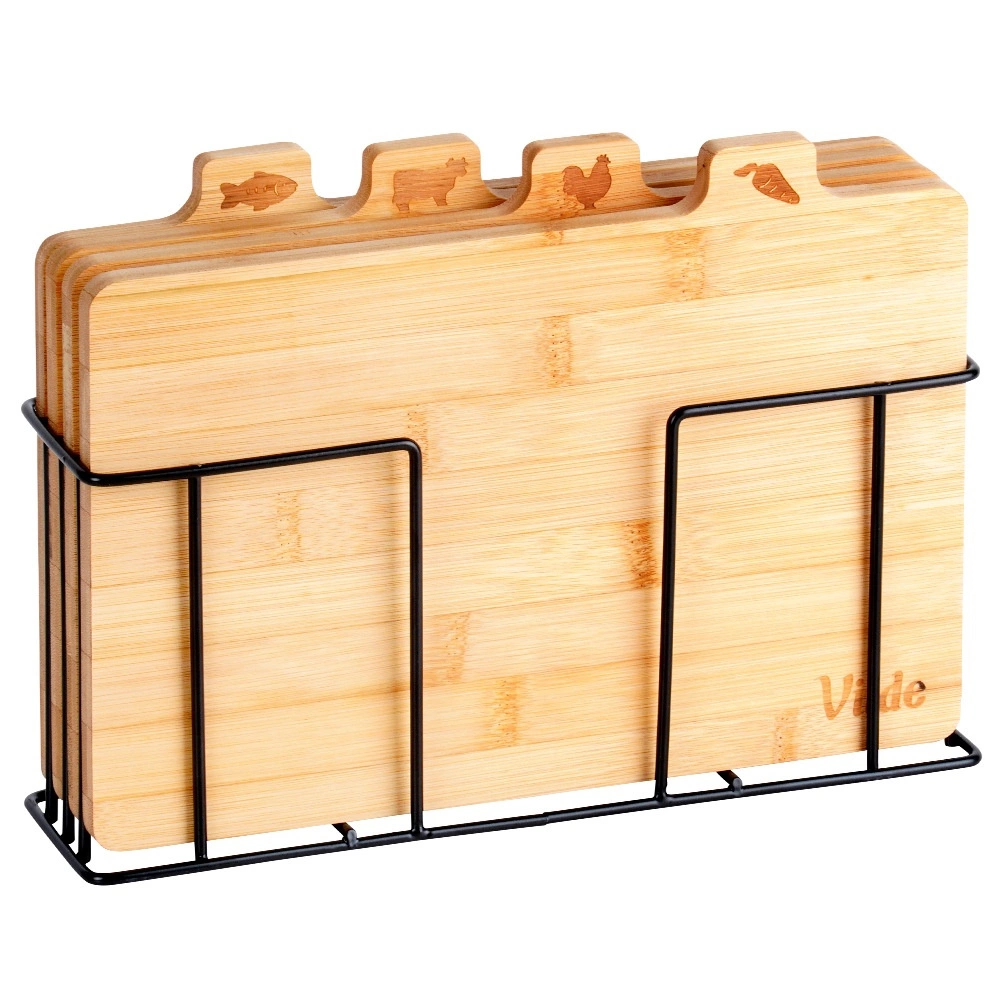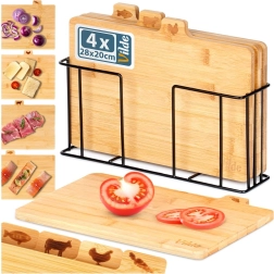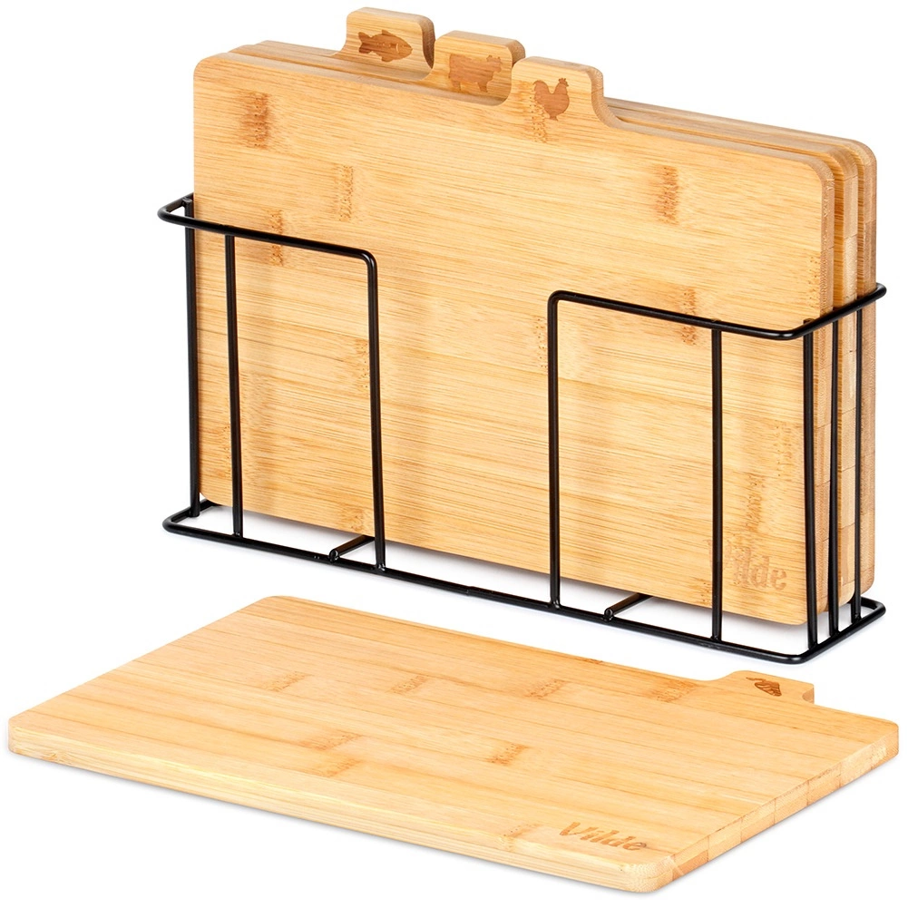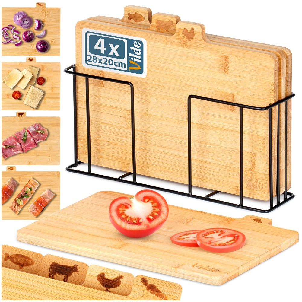 Su šiuo bambukinių lentelių rinkiniu virtuvėje palaikysite nepriekaištingą tvarką. Keturi atskiros lentelės su patogiais skirtukais ir ikonomis aiškiai nurodo jų paskirtį – daržovėms, paukštienai, mėsai ir žuviai – taip prisidedant prie higieniško maisto ruošimo. Stabilus juodos spalvos metalinis stovas užtikrina, kad lentelės visada bus po ranka ir tvarkingai sudėtos.