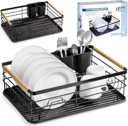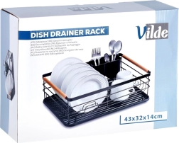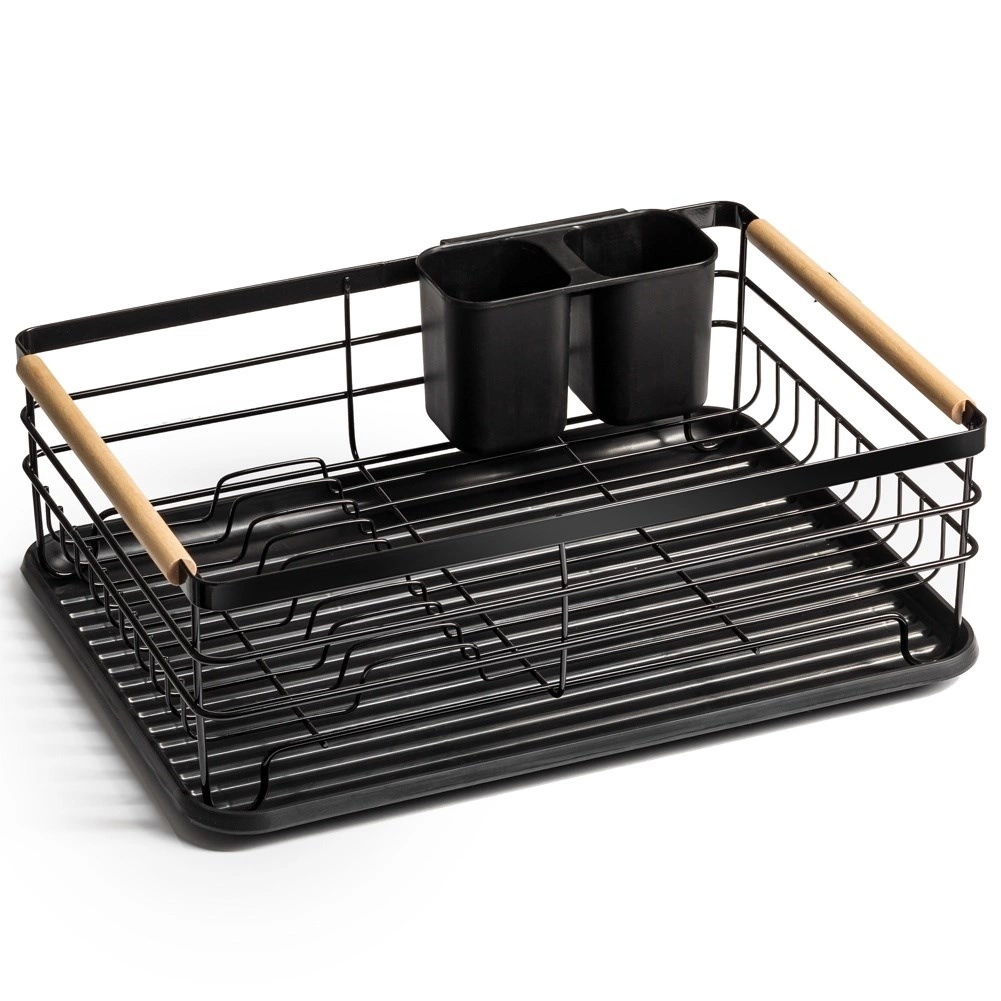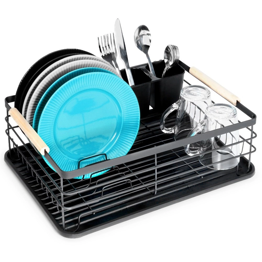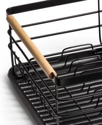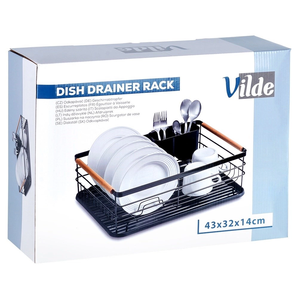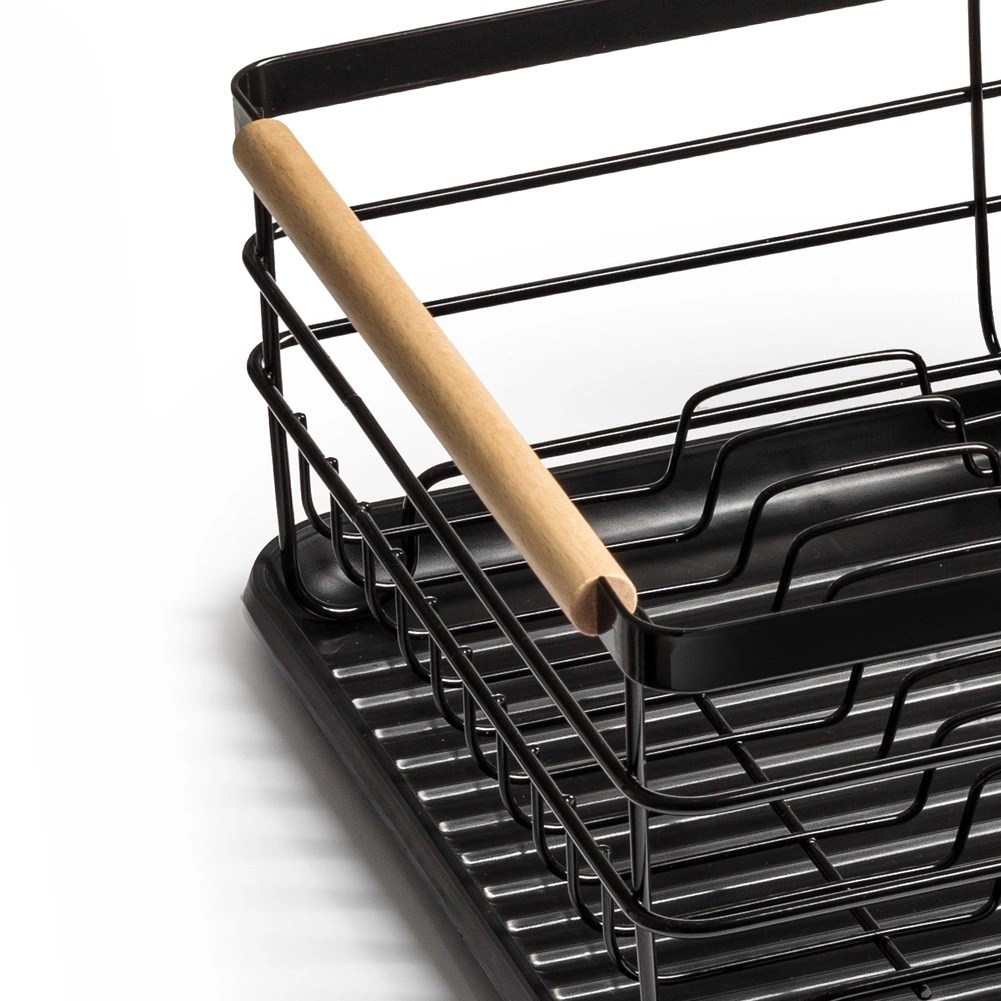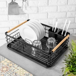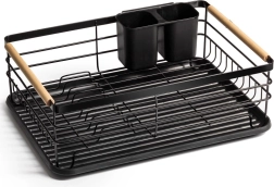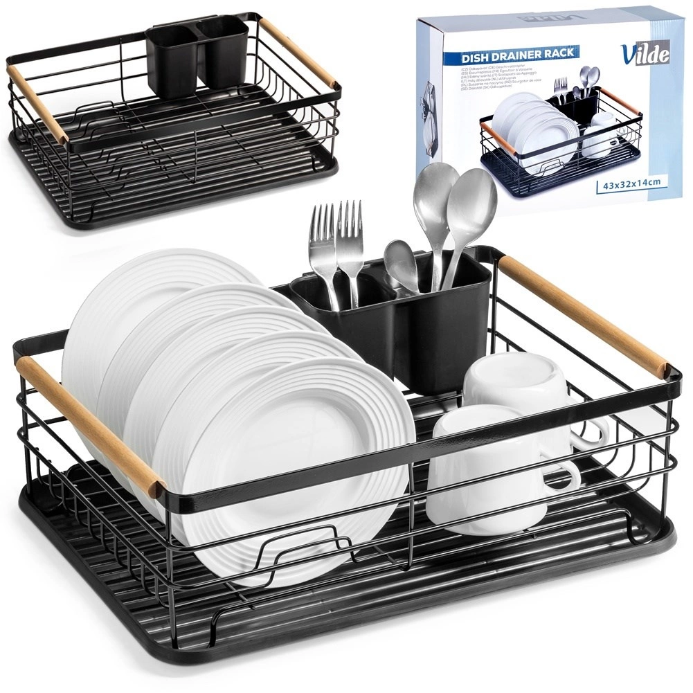 Praktiškas indų džiovintuvas, kurio matmenys 43 × 32 × 14,5 cm, palengvina lėkščių, stiklinių ir stalo įrankių džiovinimą bei tvarką ir kartu apsaugo virtuvinį stalviršį. Pagamintas iš patvaraus juodos spalvos metalo, turi išimamą lašėjimo padėklą ir dviejų skyrių stalo įrankių krepšelį. Dėl talpos iki 10 lėkščių, tvirtos vielinės konstrukcijos ir medinių bambukinių rankenų jis yra patogus nešioti ir kasdien naudoti. Stilingas industrinis dizainas puikiai tinka tiek moderniai, tiek klasikinei virtuvei.