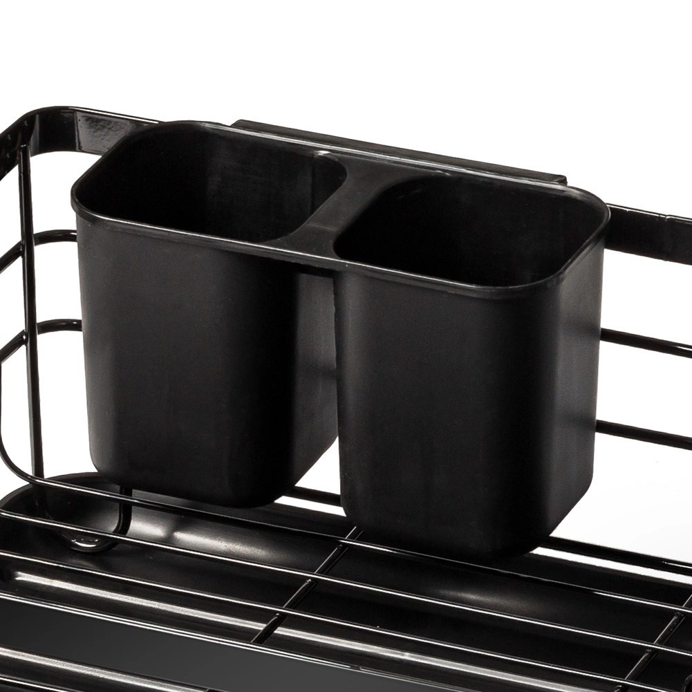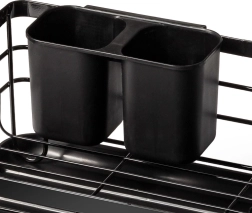 Elegantiškas ir funkcionalus indų džiovintuvas padeda palaikyti virtuvę švarią ir tvarkingą. Juodo metalo apdaila su natūraliomis bambuko rankenomis derina patvarumą ir modernią išvaizdą. Išimamas lašėjimo padėklas patikimai surenka vandenį ir palengvina valymą, o dvigubas stalo įrankių krepšelis gali būti montuojamas viduje arba išorėje, pagal poreikį.