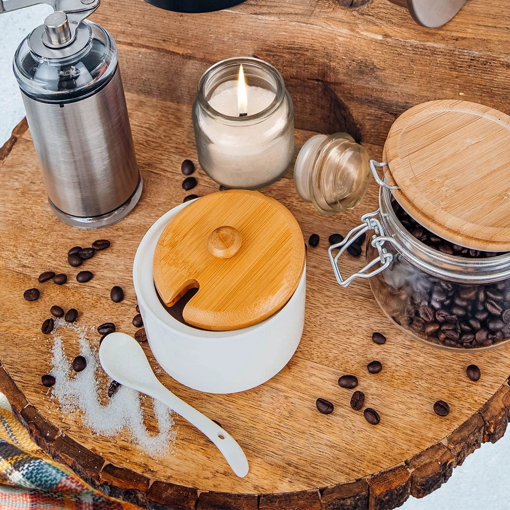 - Kokybiškos medžiagos – baltas porcelianas, bambukinis dangtelis, porcelianinis šaukštelis.