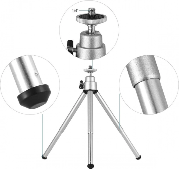 Šis kompaktiškas trikojis pagamintas iš kokybiško aliuminio, kuris garantuoja didelį atsparumą ir konstrukcijos tvirtumą. Jis puikiai tinka makrofotografijai dėl galimybės nustatyti bet kurią padėtį naudojant judančią galvutę, kuri juda trimis kryptimis. Universalus 1/4'' varžtinio sriegio tvirtinimas suderinamas su dauguma kamerų ir fotoaparatų.
