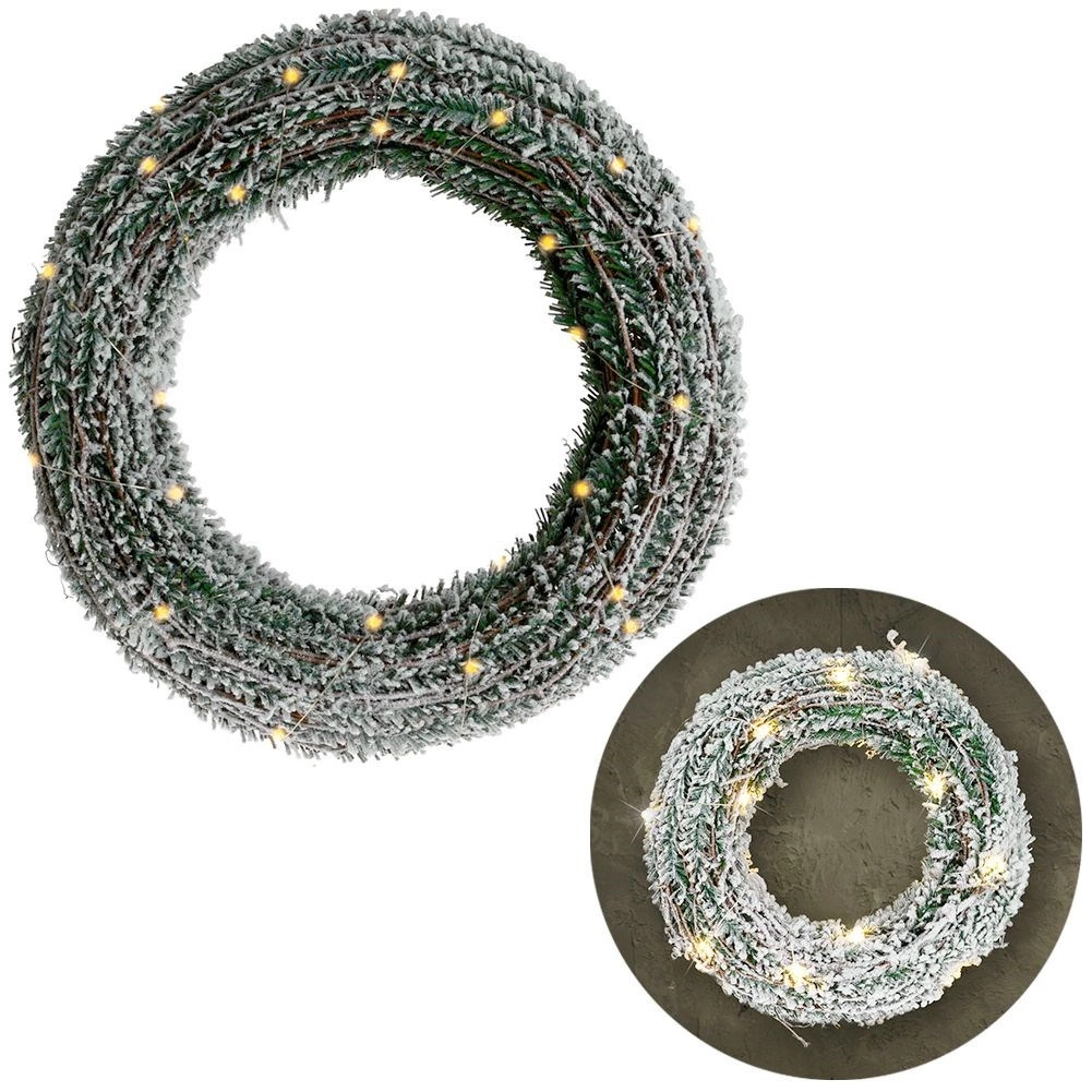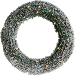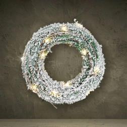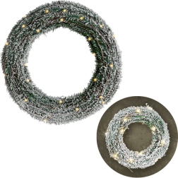 Elegantiškas 40 cm skersmens kalėdinis vainikas su 30 šiltų LED, sukuriantis jaukią atmosferą. Siūlo realistiškas spygliais su sniego efektu, galima pakabinti arba pastatyti, 6/18 val. laikmatis ir maitinimas baterijomis, kad būtų lengva pastatyti bet kur interjere.
