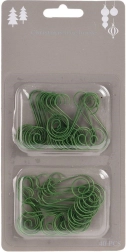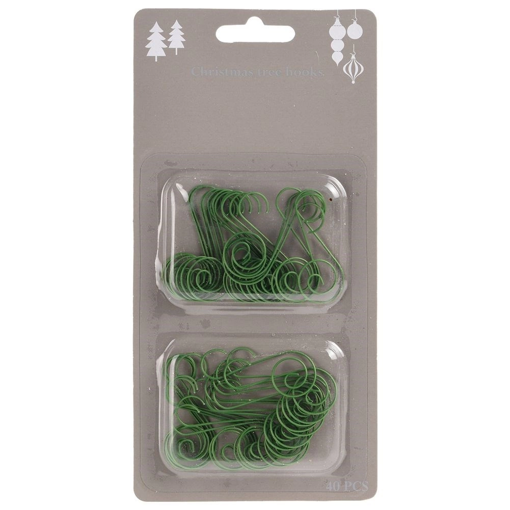 Praktiškas rinkinys – 40 žalių metalinių kabliukų, kurių ilgis 4,5 cm, skirtų lengvam ir saugiam kalėdinių kamuoliukų ir papuošalų kabinimui ant eglutės. Patvari medžiaga, nekrintanti į akis žalia spalva susilieja su spygliuočiais ir užtikrina elegantišką išvaizdą. Daugkartinio naudojimo ir pagaminti pagal Europos standartus.