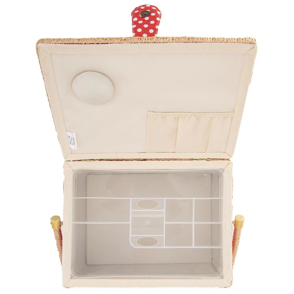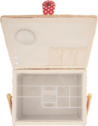 Viduje rasite išimamą plastikinį organizatorių su 4 skyreliais siūlams, adatoms, įvėrikliams ar sagoms. Jį išėmus, gausite erdvią kamerą didesniems siuvėjo įrankiams. Vidinėje dangčio pusėje yra elastinė kišenėlė ir adatų pagalvėlė, į kurią patogiai įsmeigsite smeigtukus ir adatas. Krepšelis taip pat puikiai tinka kaip papuošalų organizatorius.