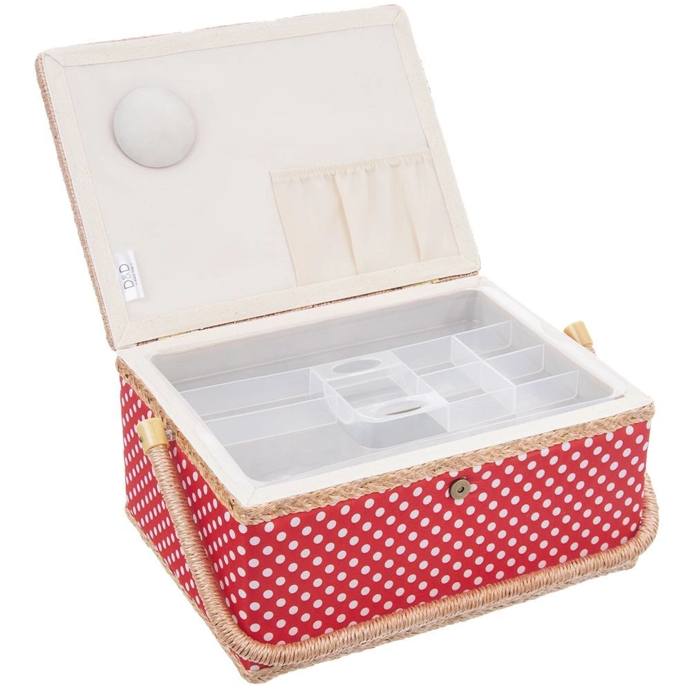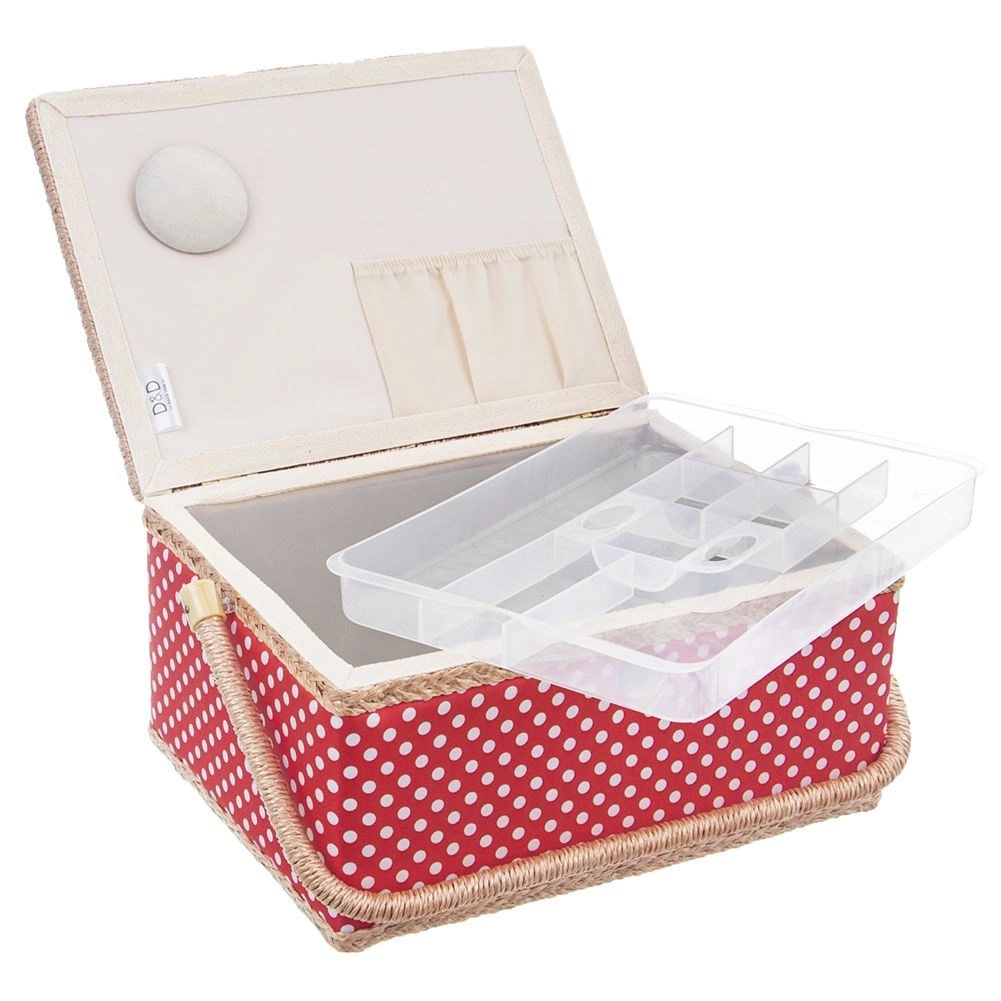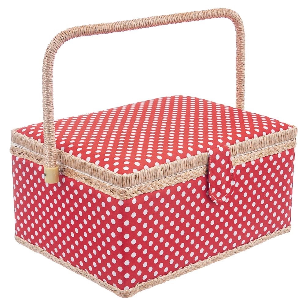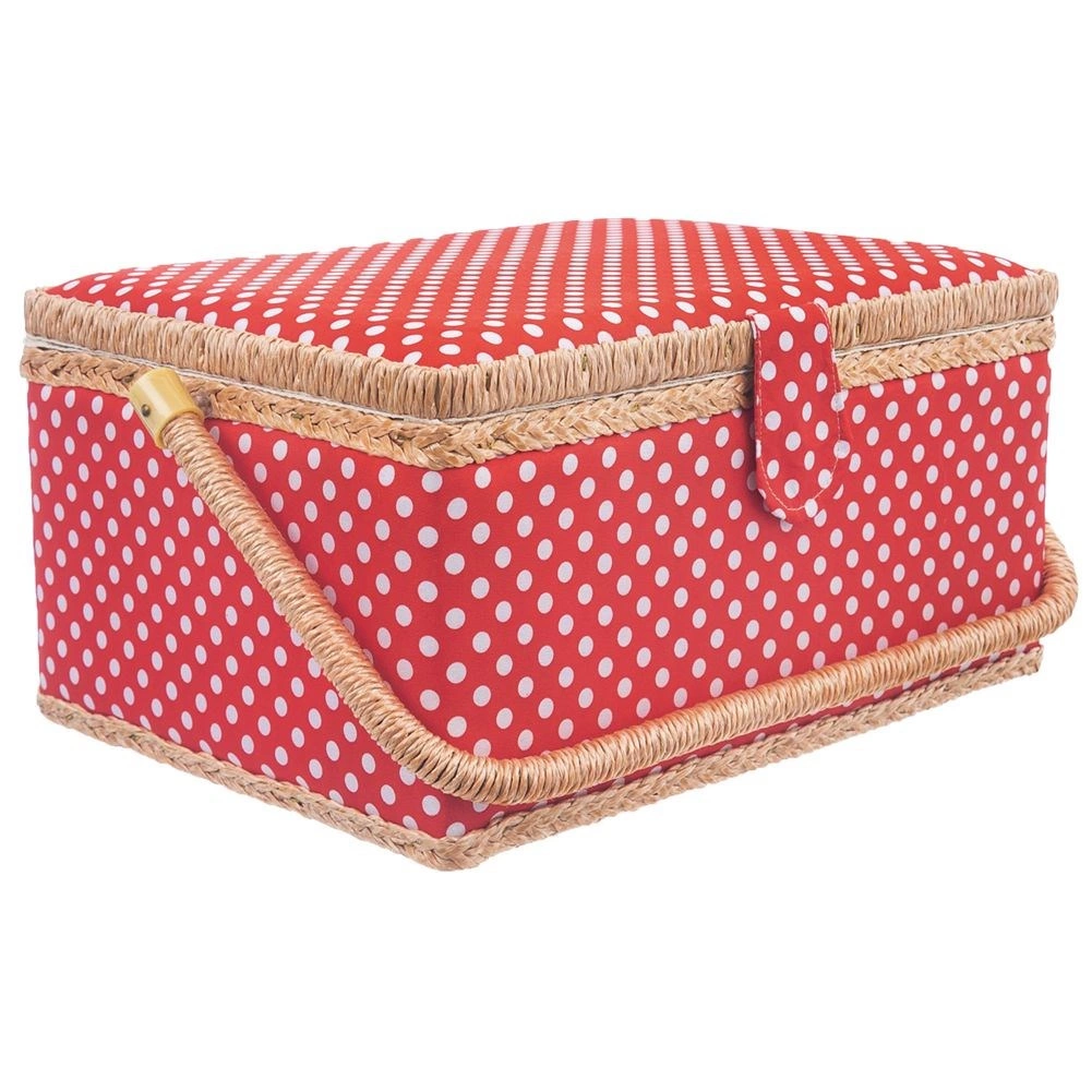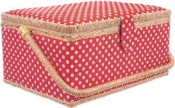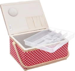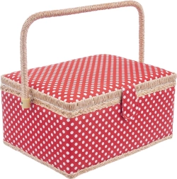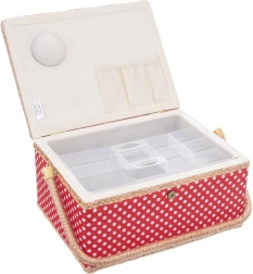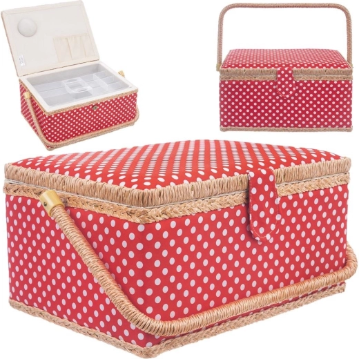 Šis siuvimo krepšelis derina patrauklų dizainą ir apgalvotą organizavimą. Krepšelio korpusas aptrauktas raudonu audiniu su baltais taškeliais, papildytas tvirta rankena patogiam nešiojimui. Dėl magnetinio užsegimo krepšelį patikimai uždarysite vienu judesiu, o turinys liks savo vietoje net pernešant.