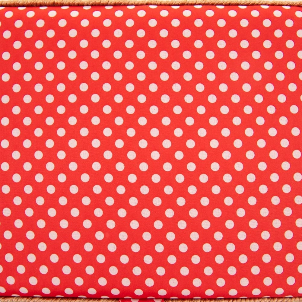 Raudonas audinys su baltais taškeliais ir dekoratyvinis apvyniojimas suteikia siuvimui žavesio, o krepšelis puikiai tinka bet kuriai namų dirbtuvei.