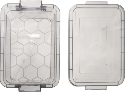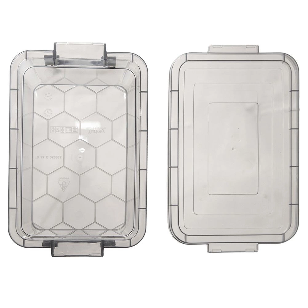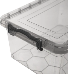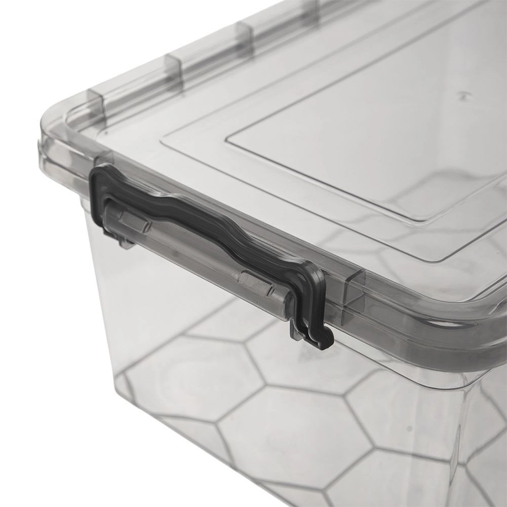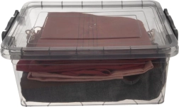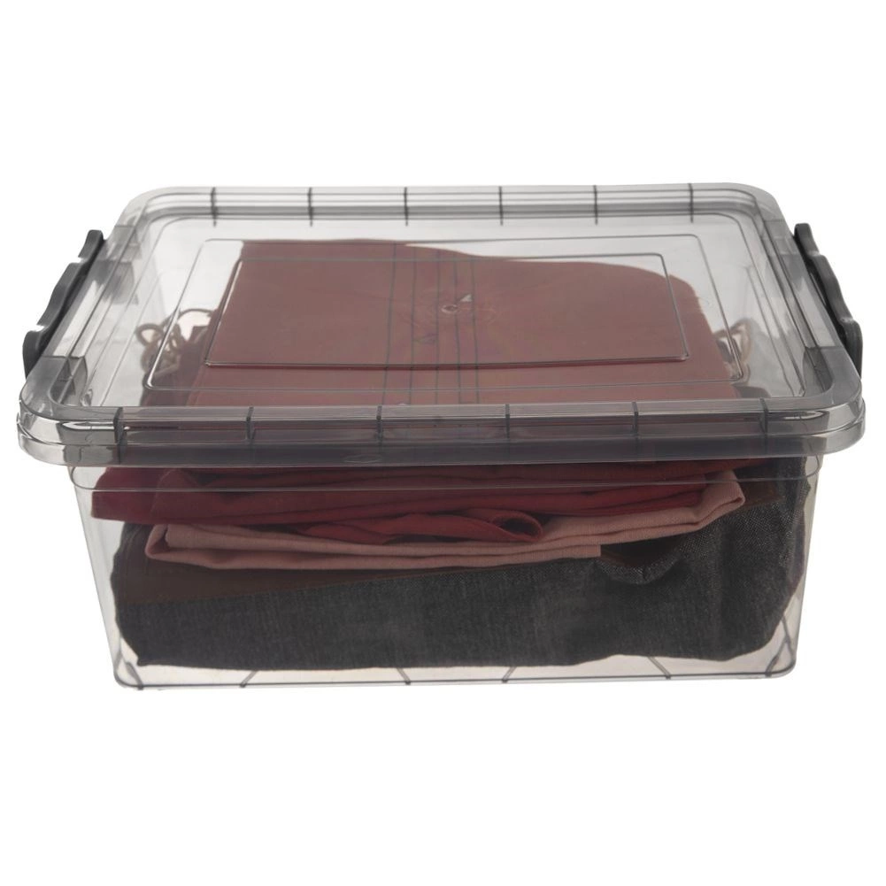 Universalus 14 l talpos plastikinis dėklas su saugiu dangčiu ir segtukais idealiai tinka maisto, drabužių ir smulkių daiktų laikymui. Dėl skaidraus tamsiai pilko dizaino turinį lengvai matysite neatidarę. Medžiaga yra be BPA, atspari temperatūroms nuo -25 °C iki +95 °C, tinka indaplovei, mikrobangų krosnelei (be dangčio), šaldytuvui ir šaldikliui. Uždarytas dangtis su dviem segtukais saugo turinį nuo drėgmės ir dulkių bei leidžia saugiai transportuoti.