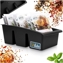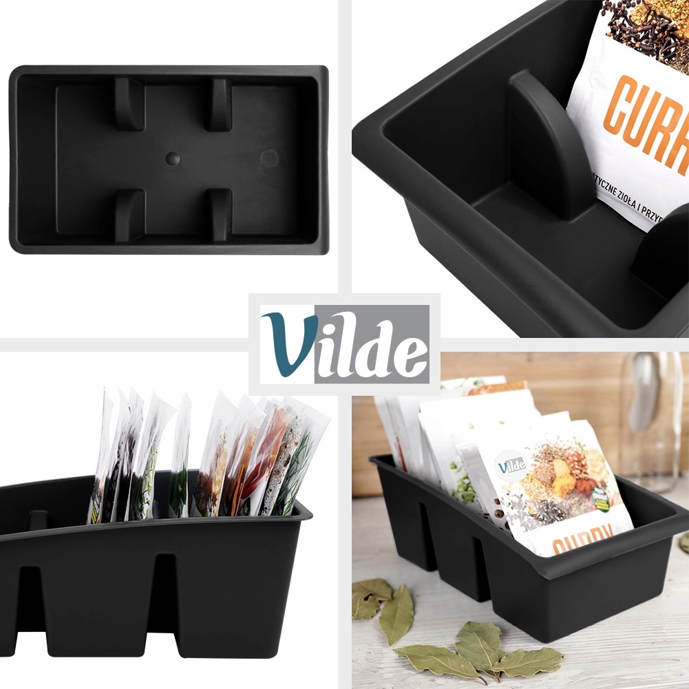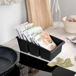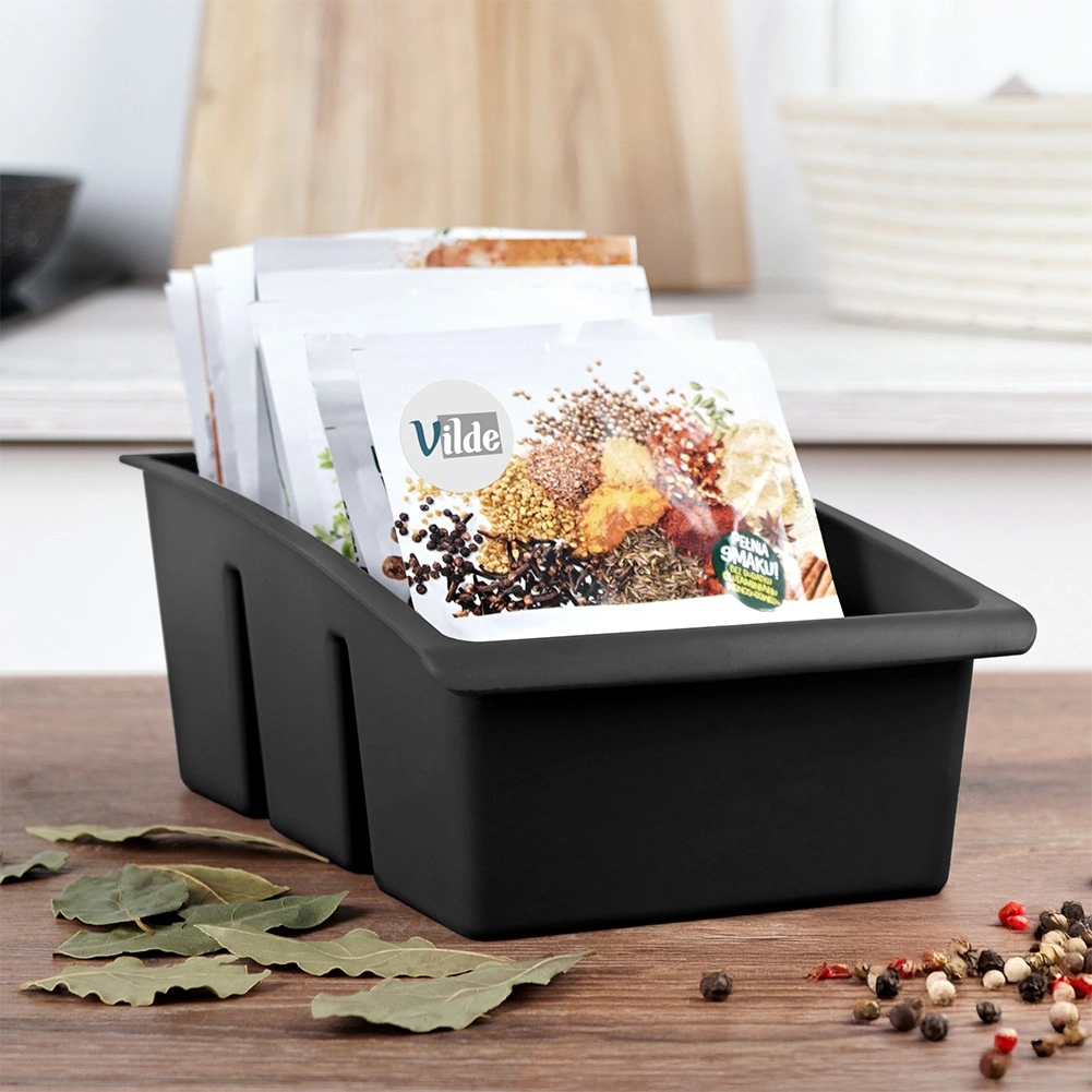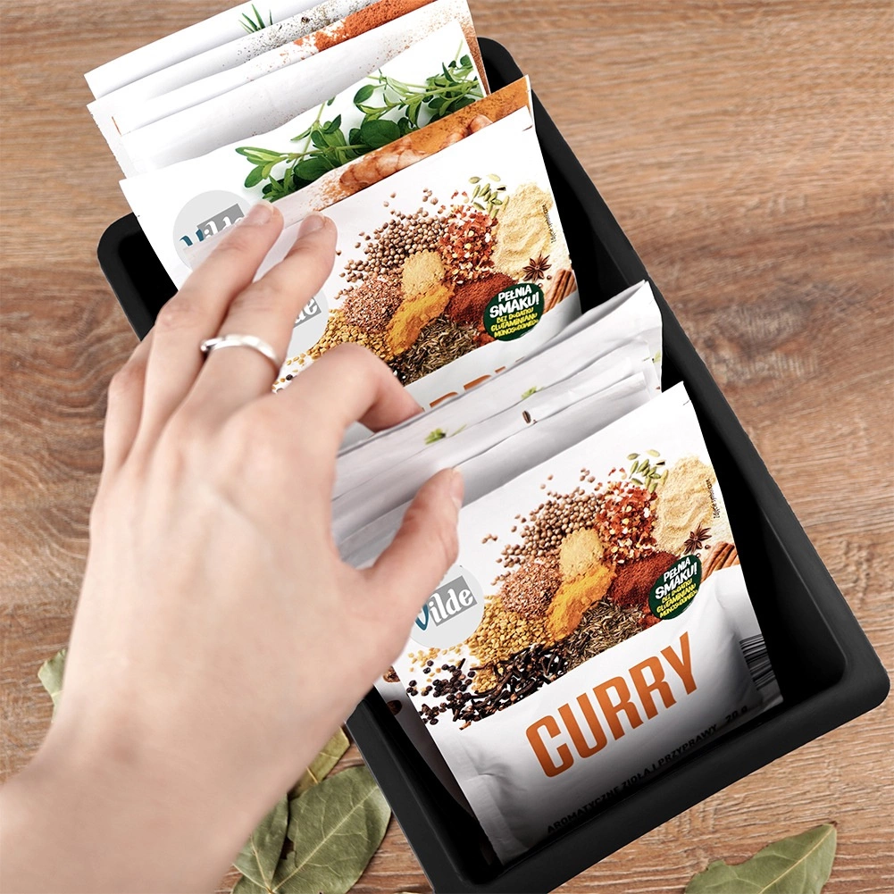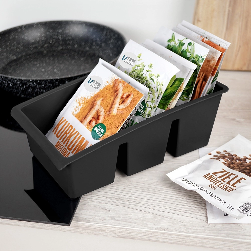 Šis praktiškas virtuvės organizatorius sukurtas tvarkingam prieskonių ir žolelių pakelių laikymui. Trys atskiri skyriai laiko pakelius stabiliai vertikalioje padėtyje, tad visada greitai rasite tai, ko reikia. Juoda spalva dera prie bet kurios modernios virtuvės, o patvari medžiaga lengvai valoma.