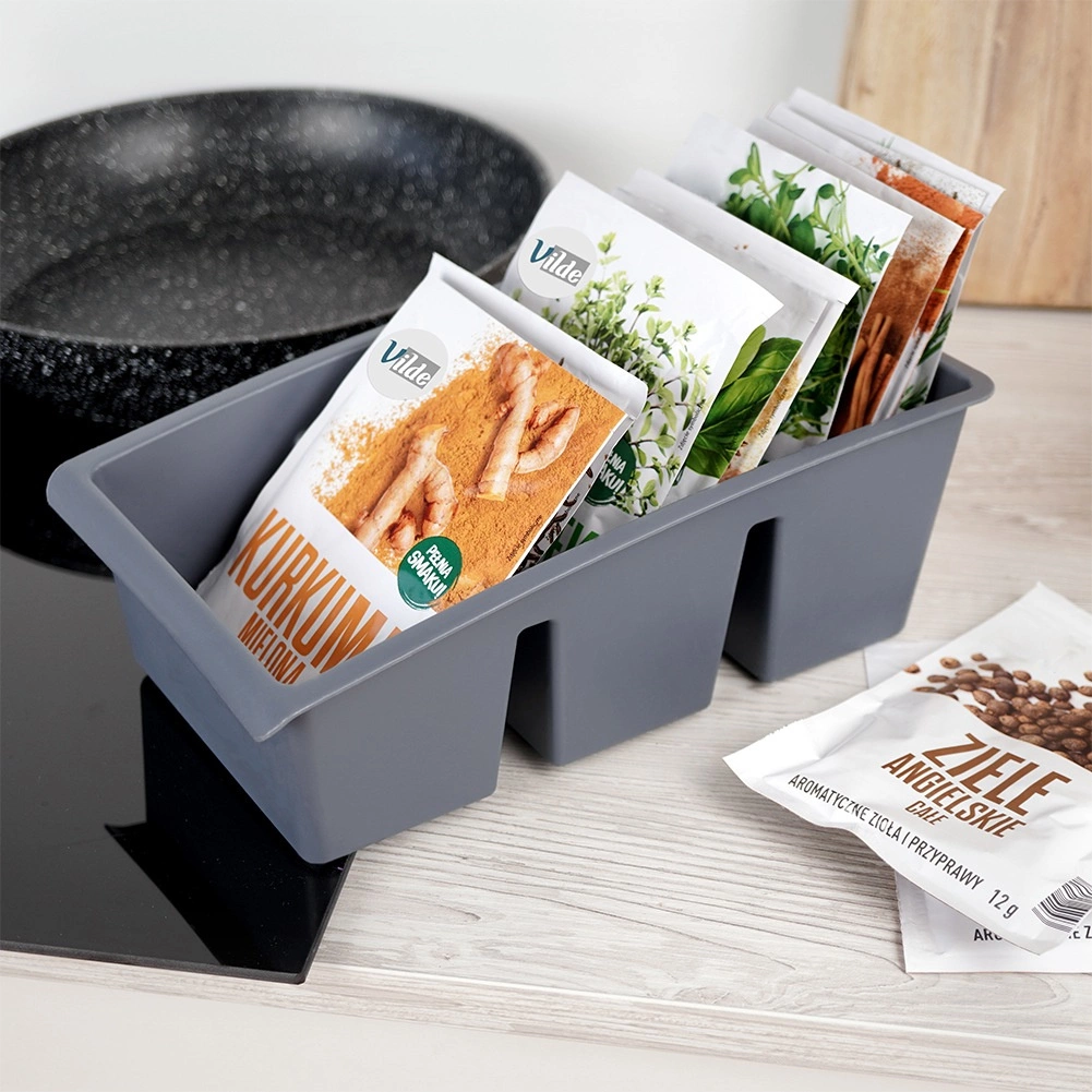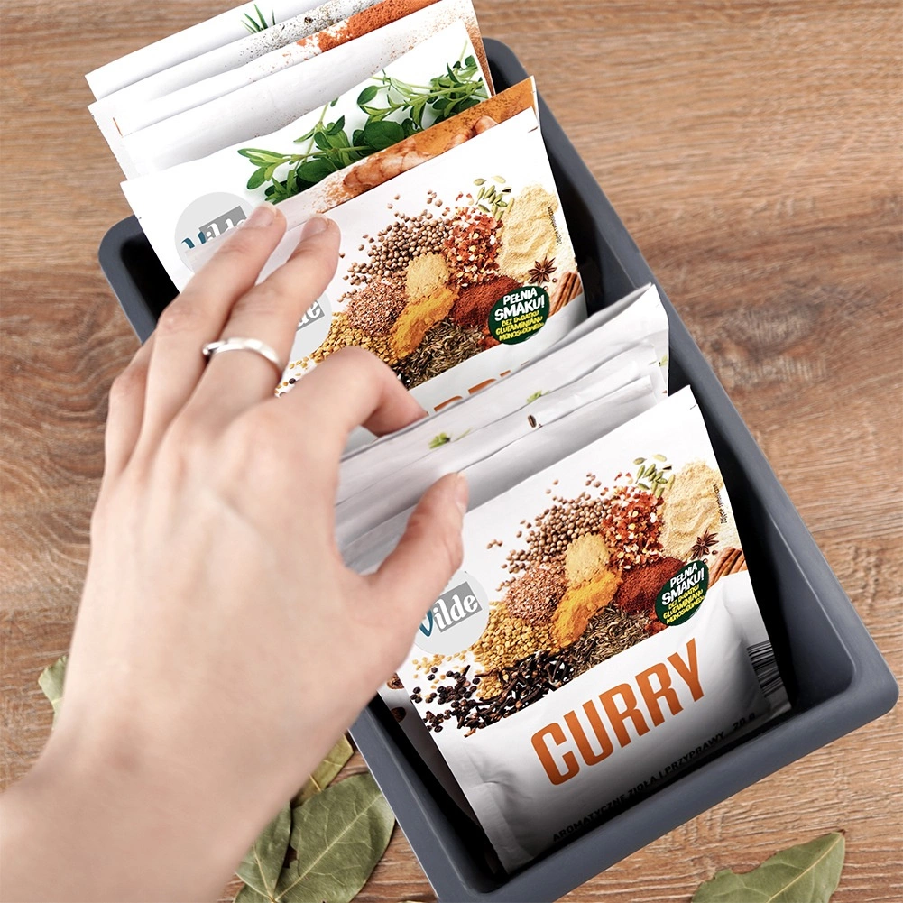 Praktiškas virtuvinis organizatorius laiko prieskonių ir žolelių pakelius tvarkingai pastatytus ir visada po ranka. Dėl dviejų vidinių pertvarų jis padalintas į tris dalis, todėl prieskonius lengvai surūšiuosite pagal tipą ar paskirtį. Žemas priekinis kraštas užtikrina gerą matomumą ir greitą reikiamo pakelio išėmimą.