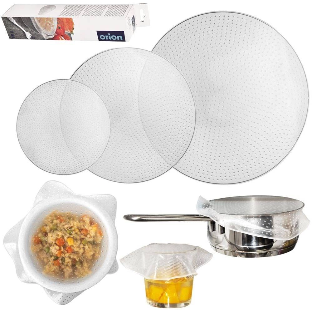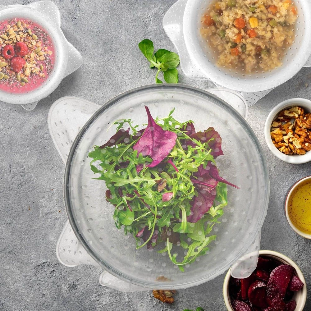 Laikykite maistą ilgiau šviežią ir virtuvę švaresnę. Silikoniniai dangteliai trijų populiarių skersmenų 15/20/26 cm elastingai prisitaiko prie įvairių indų kraštų ir sukuria patikimą uždengimą. Dėl subtilios perforacijos/struktūros ir elastingumo jie lengvai praleidžia garus ir kartu sumažina taškymąsi bei kvapų sklaidą.