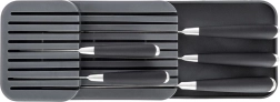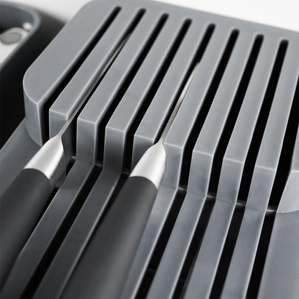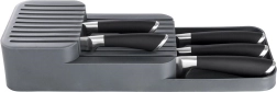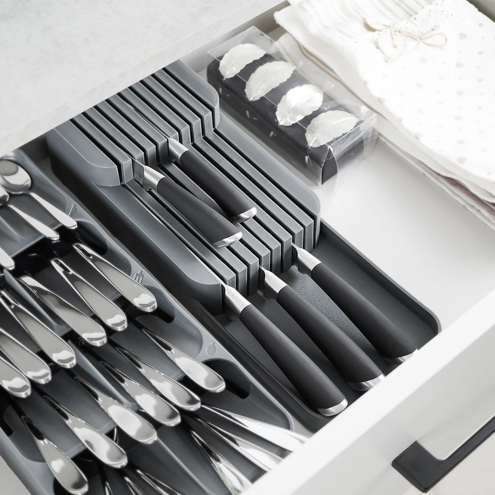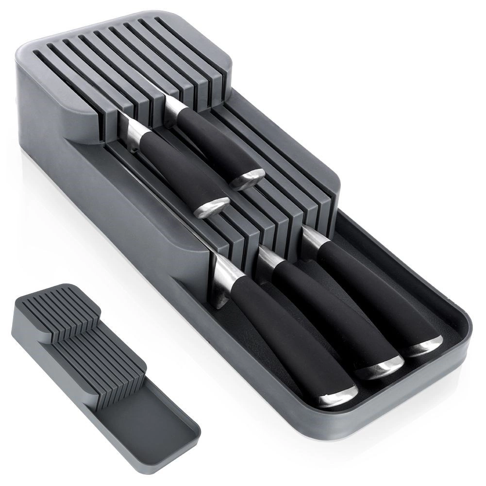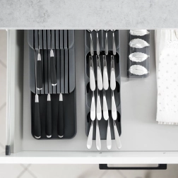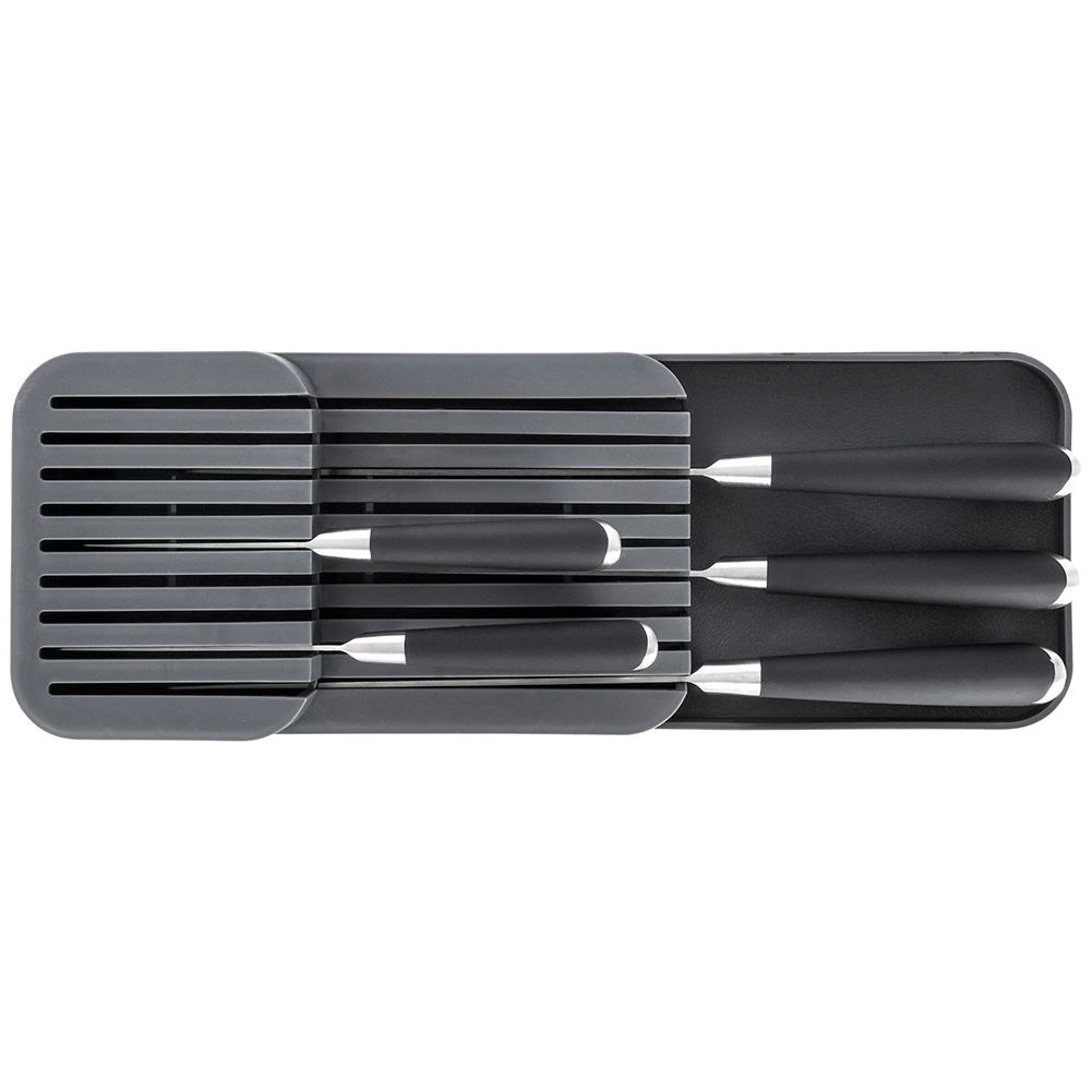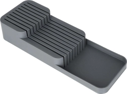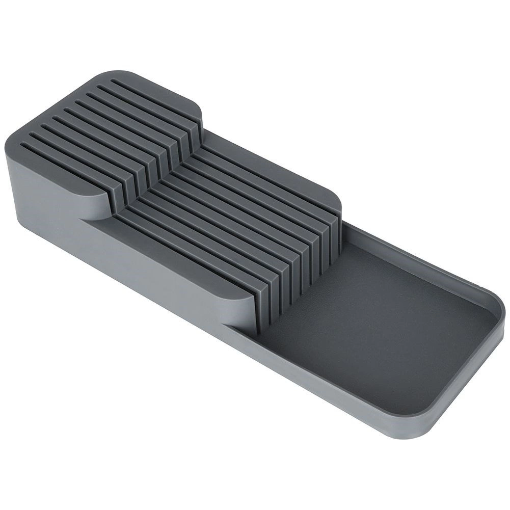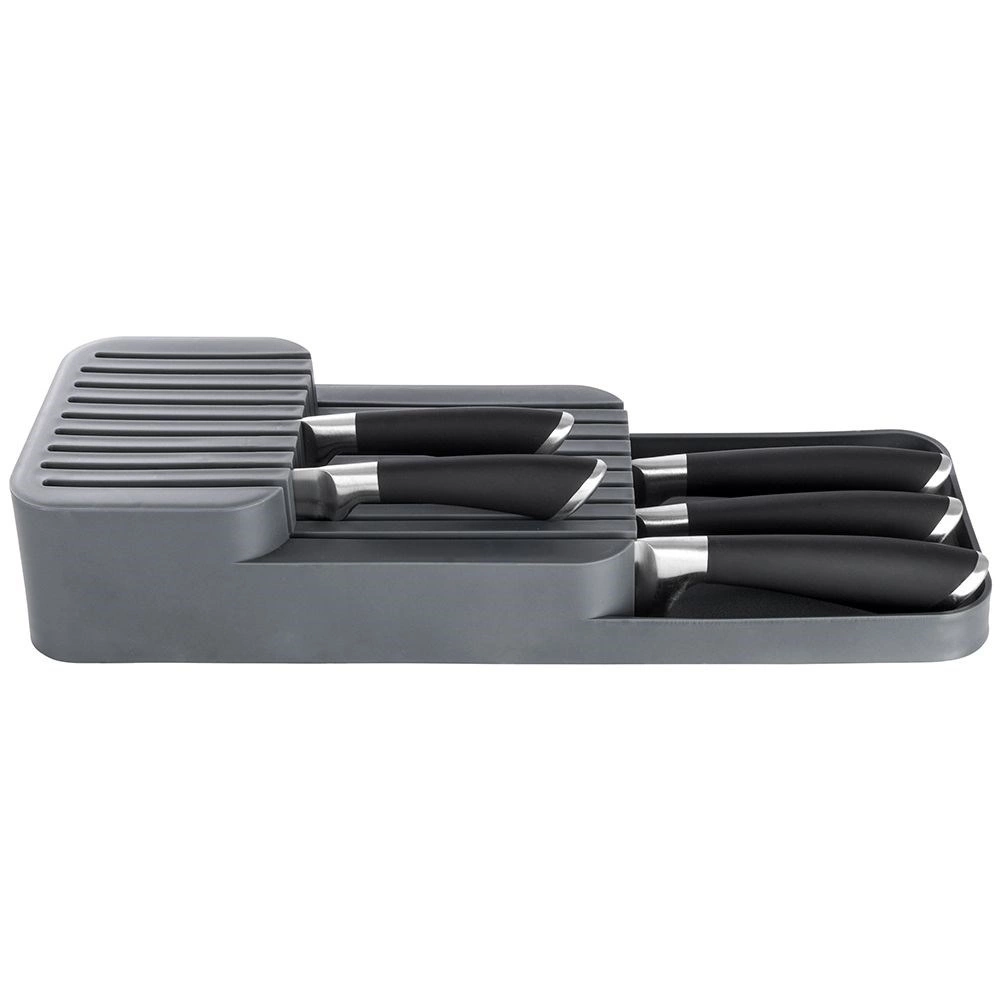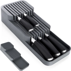 Laikykite virtuvinius peilius saugiai ir tvarkingai su sumaniu pilkos spalvos stalčiaus organizatoriumi. Kompaktiški matmenys ir dviaukštė sandara taupo vietą stalčiuje, o iki 18 peilių vietų saugo ašmenis ir jūsų pirštus. Patvarus plastikas užtikrina ilgaamžiškumą, o universali dydžio konstrukcija tinka daugumai stalčių.
