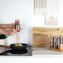 Elegantiškas metalinis korpusas patogiai laikosi, neslystantis elementas užtikrina tvirtą suėmimą ir lengvą malimą net viena ranka. Praktiškas dangtelis saugo turinį nuo oro ir drėgmės, todėl prieskoniai išlieka ilgiau švieži ir kvapnūs.
