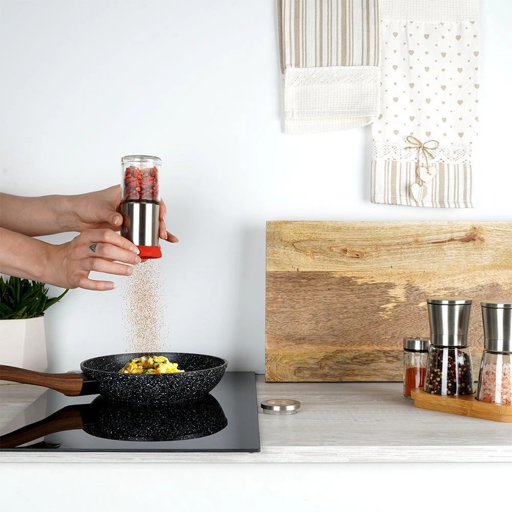 Skaidrus stiklas leidžia kontroliuoti prieskonių kiekį ir tipą bei suteikia elegantišką išvaizdą ant virtuvės stalviršio.