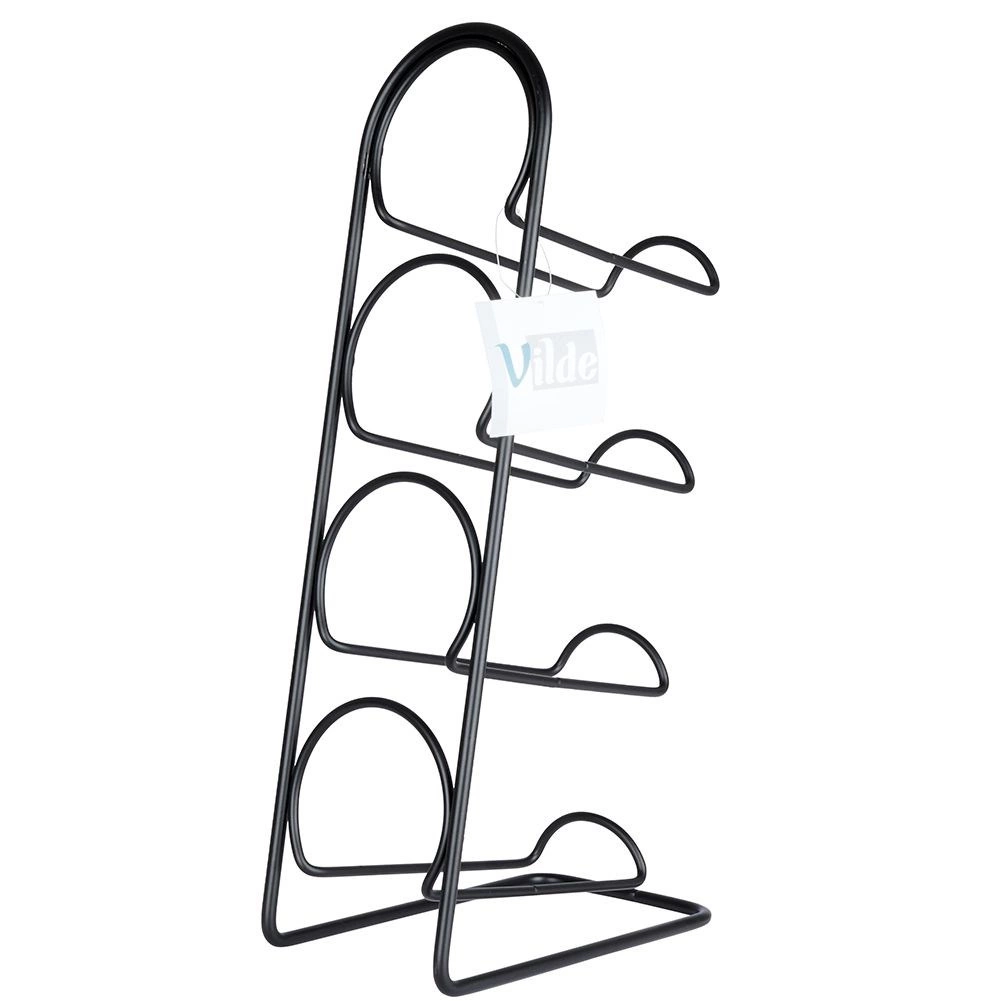 Praktiška ir išraiškinga vyno lentyna su minimalistiniu vieliniu dizainu talpina iki keturių vyno ar kitų gėrimų butelių. Tvirta metalinė konstrukcija matinės juodos spalvos yra atspari, stabili ir lengvai prižiūrima. Dėl horizontalaus butelių laikymo vynas guli tinkamai, o kamštis išlieka drėgnas.