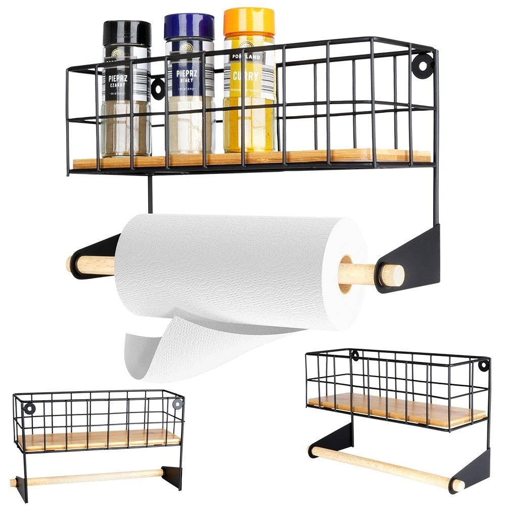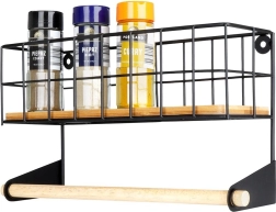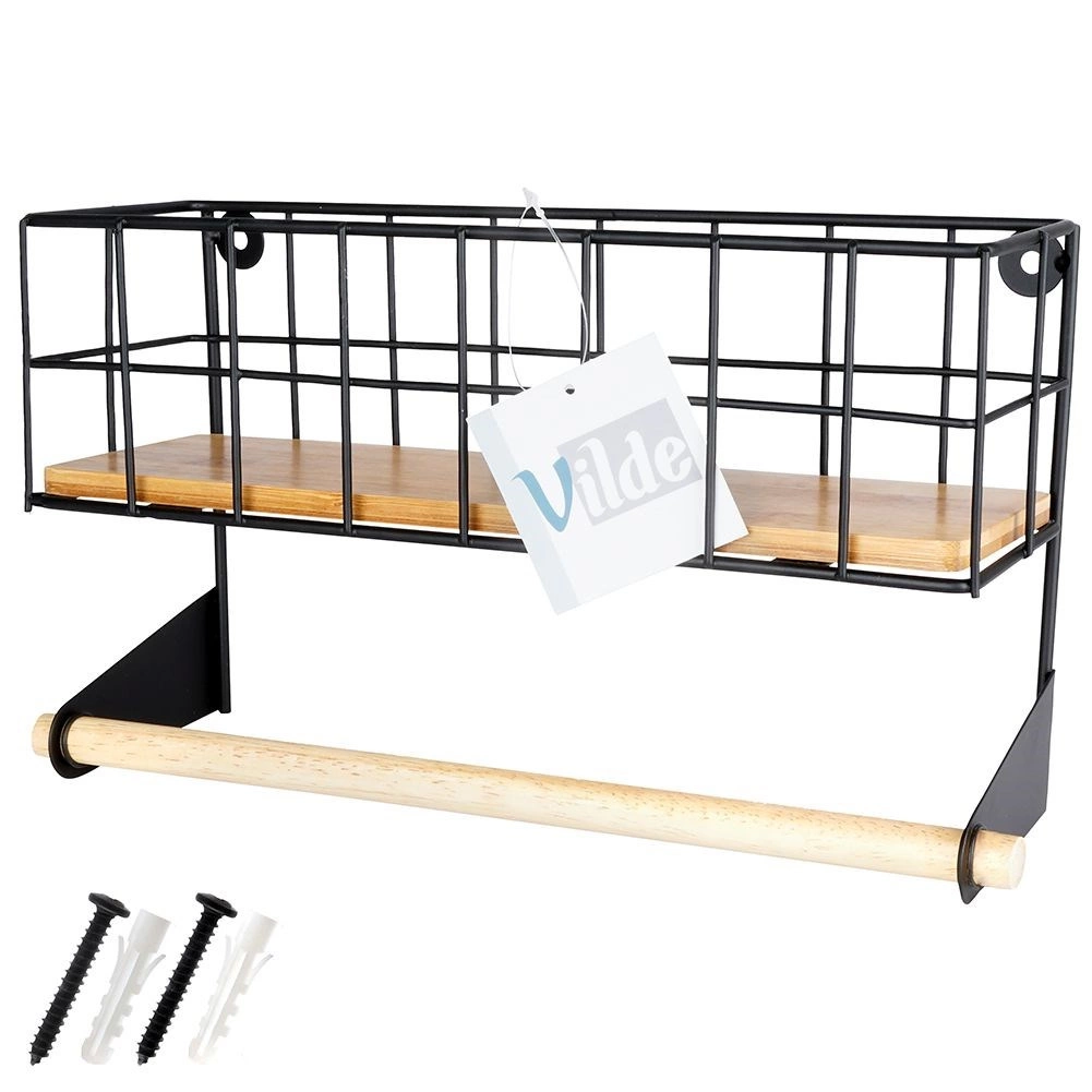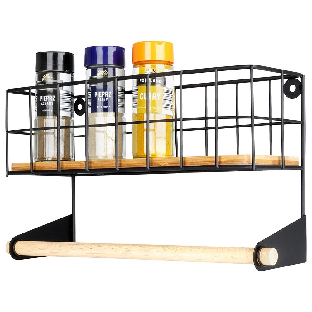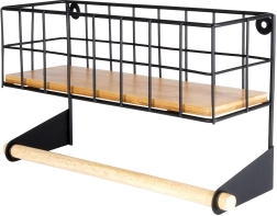 Ši sieninė lentyna su integruotu popierinių rankšluosčių laikikliu padės sumaniai susiorganizuoti virtuvę. Viršutinis krepšelis talpina prieskonius ar mažas dėžutes, apatinė medinė lazdelė užtikrina patogų rankšluosčių vyniojimą. Patvari konstrukcija iš juodo milteliniu būdu dengto metalo ir bambuko detalės suteikia erdvei modernų industrinį įvaizdį.