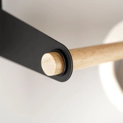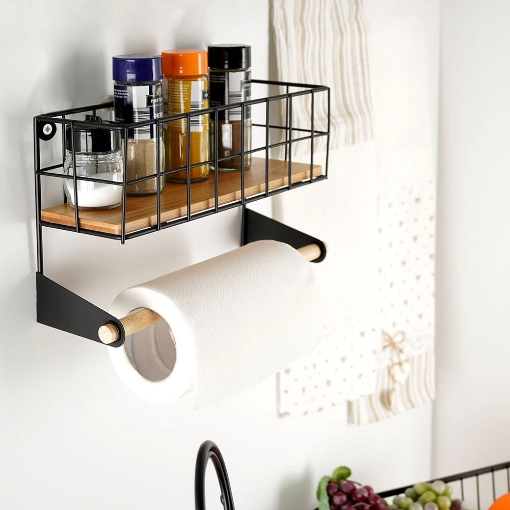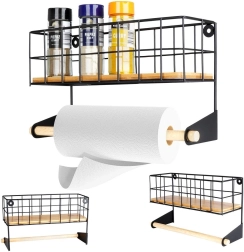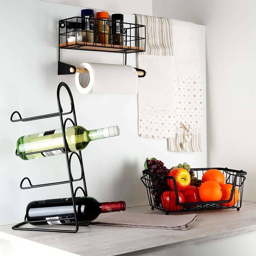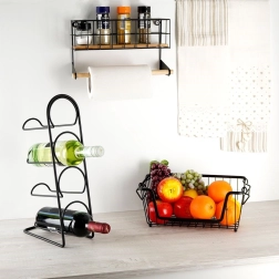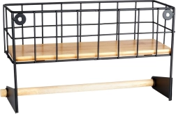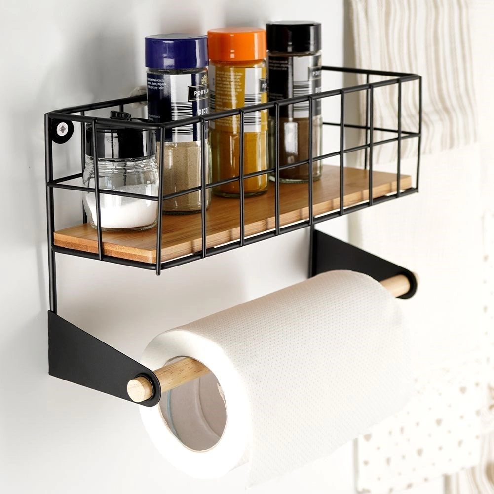Ši sieninė lentyna su integruotu popierinių rankšluosčių laikikliu padės sumaniai susiorganizuoti virtuvę. Viršutinis krepšelis talpina prieskonius ar mažas dėžutes, apatinė medinė lazdelė užtikrina patogų rankšluosčių vyniojimą. Patvari konstrukcija iš juodo milteliniu būdu dengto metalo ir bambuko detalės suteikia erdvei modernų industrinį įvaizdį.