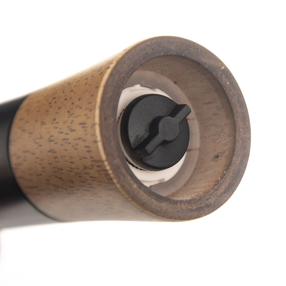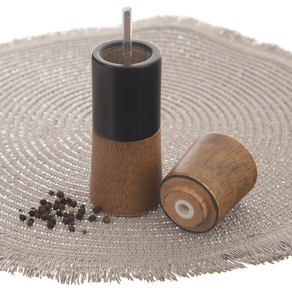 Stilingas rankinis pipirų, druskos ir kitų prieskonių malūnėlis, 15,5 cm aukščio, derinantis natūralų medį ir juodus akcentus. Turi keraminį malimo mechanizmą, sklandų malimo stambumo reguliavimą ir ergonomišką formą patogiam naudojimui. Šviežiai sumalti prieskoniai suteikia patiekalams intensyvų aromatą ir skonį, o malūnėlis taps elegantišku jūsų virtuvės akcentu.