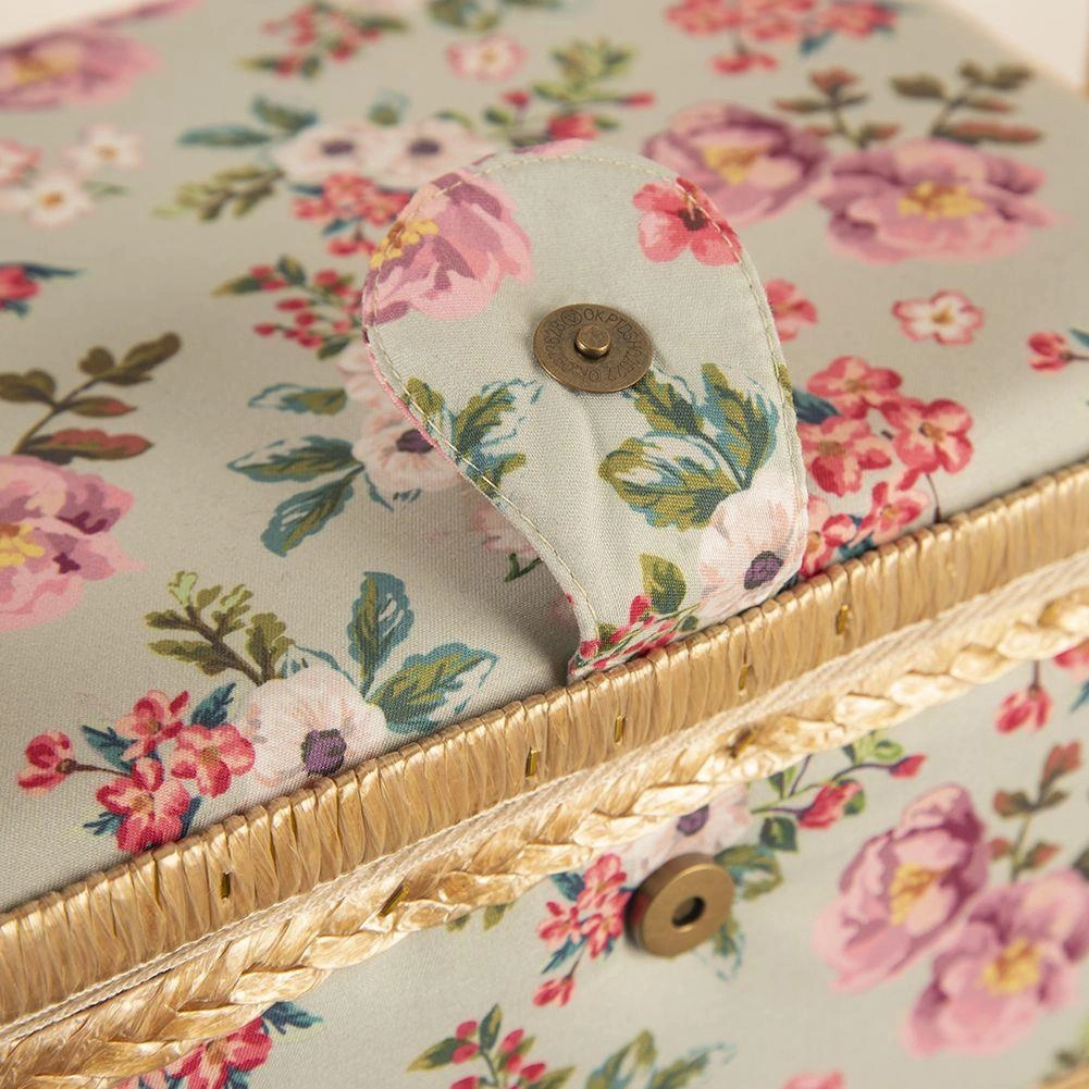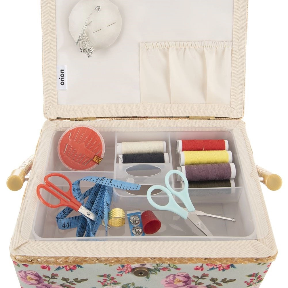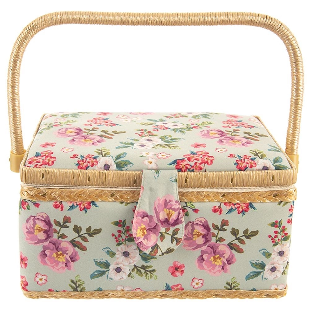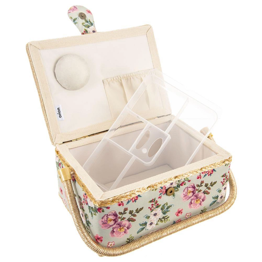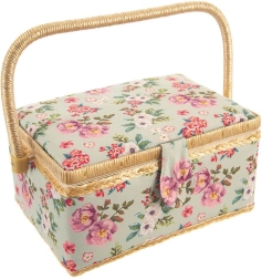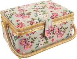 Elegantiška siuvinėjimo dėžutė, primenanti praktišką krepšelį su gėlių raštu, skirta tvarkingam siuvimo reikmenų laikymui. Joje yra išimamas permatomas organizatorius su 4 skyreliais, magnetinis užsegimas saugiam nešiojimui ir sulankstoma rankena patogiam laikymui rankoje. Viduje taip pat rasite kišenę ir adatėlę smeigtukams bei adatoms.