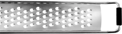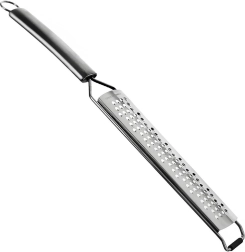 Praktiška plokščia nerūdijančio plieno tarkuotė, 38 cm ilgio ir 4 cm pločio, greitam ir tolygiam tarkavimui. Dėl aštrių angų lengvai sutarkuosite daržoves, kietuosius sūrius, česnaką, riešutus ir citrusų žievelę. Turi ilgą rankeną su kilpele pakabinimui, neslystančią galinę dalį saugiam naudojimui ant indų ir apsauginį dėklą saugiam laikymui. Tinka plauti indaplovėje.