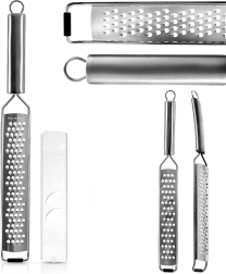 Aštrios perforacijos užtikrina smulkius ir tolygius rezultatus tarkuojant daržoves, kietą sūrį, šokoladą ar prieskonius, tokius kaip imbieras, cinamonas ar muskato riešutas. Praktinis apsauginis dėklas saugo ašmenis ir kitus įrankius stalčiuje bei palengvina laikymą.