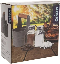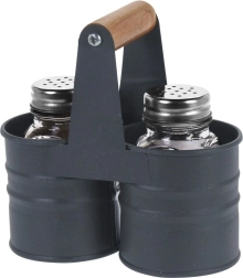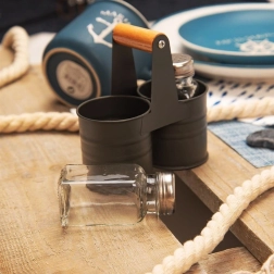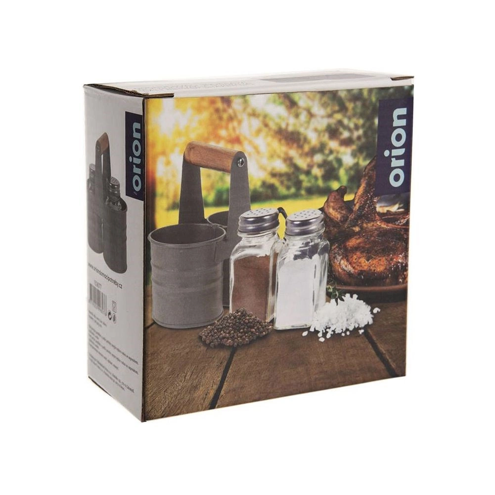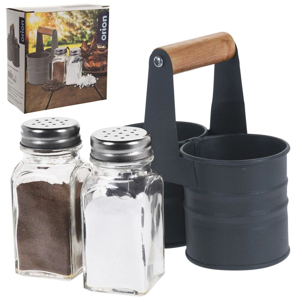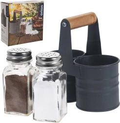 Elegantiškas druskinės ir pipirinės rinkinys su stikliniais indeliais praktiškame metaliniame stove su medine rankena. Kompaktiški matmenys 13 × 6 × 12,5 cm, kiekvieno indelio talpa 75 ml. Patogus dozavimas dėl perforuotų nerūdijančio plieno dangtelių, lengvas valymas ir universalus naudojimas namuose bei maitinimo įstaigose.